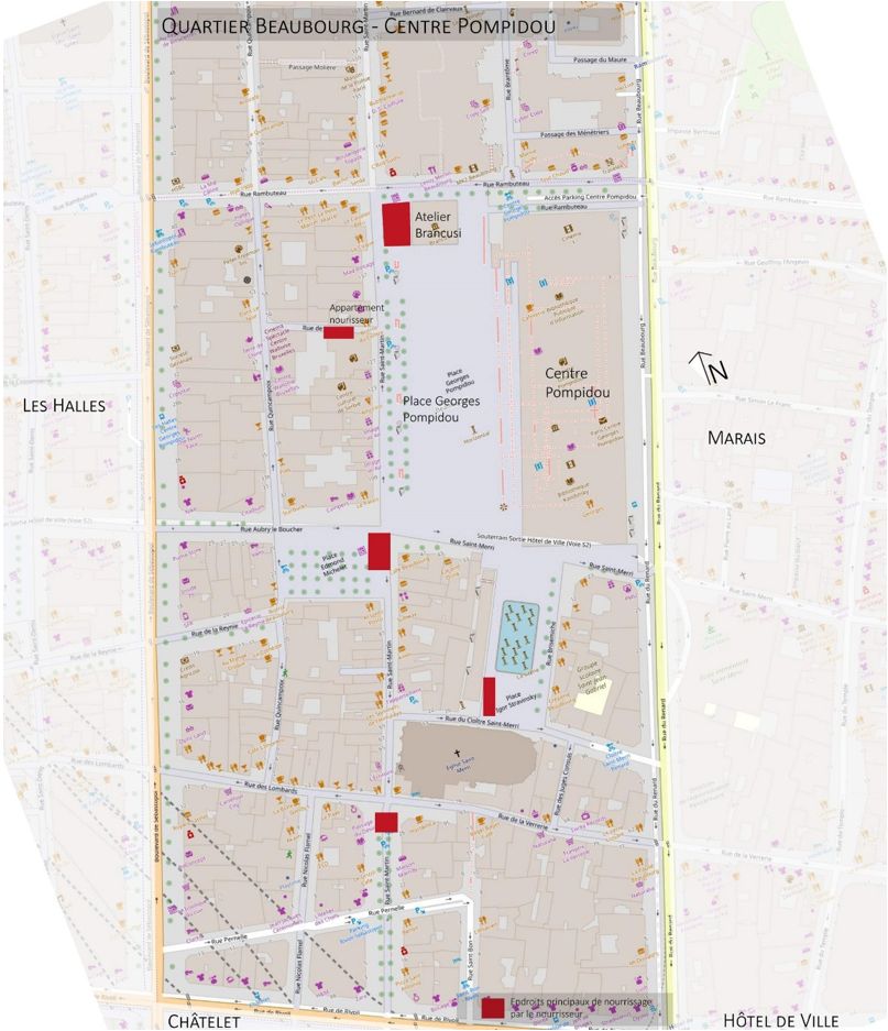 1. Carte du Quartier Beaubourg – Centre Pompidou (adaptée par l’auteur à partir d’un fond OpenStreetMap, 2019)
