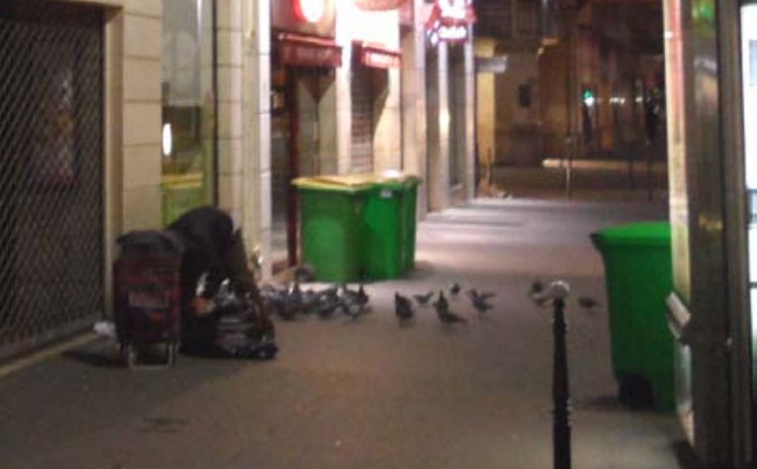 2. 6h19-6h28. Le nourrisseur cherchant du pain pour les pigeons dans les poubelles d’une boulangerie de la rue de Rivoli. Le moment est précisément choisi : il s’agit de l’étroite fenêtre temporelle entre le moment où les employés de la boulangerie sortent les déchets de pain et celui où la voirie ramasse les poubelles (Messieux, 2010)