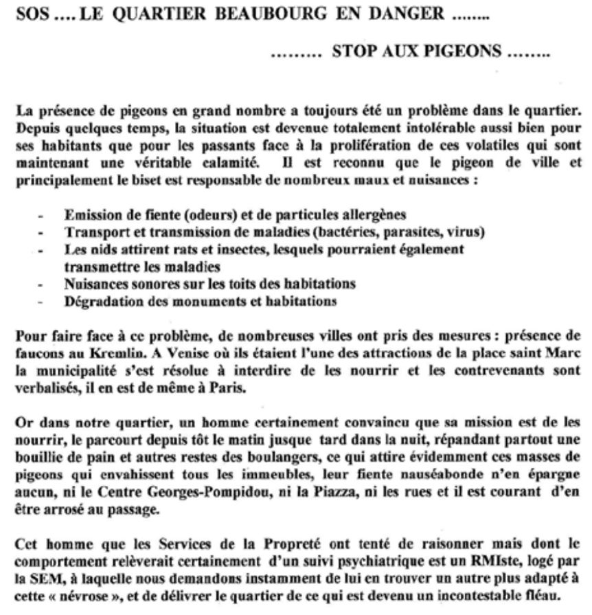 3. Pétition demandant l’expulsion du quartier du nourrisseur, rédigée par la présidente de l’association « Vivre au Beaubourg Village ». Elle a été adressée à des commerçants, gestionnaires et habitants du quartier pour qu’ils la signent et l’adressent ensuite au gestionnaire immobilier responsable du logement du nourrisseur (2008).