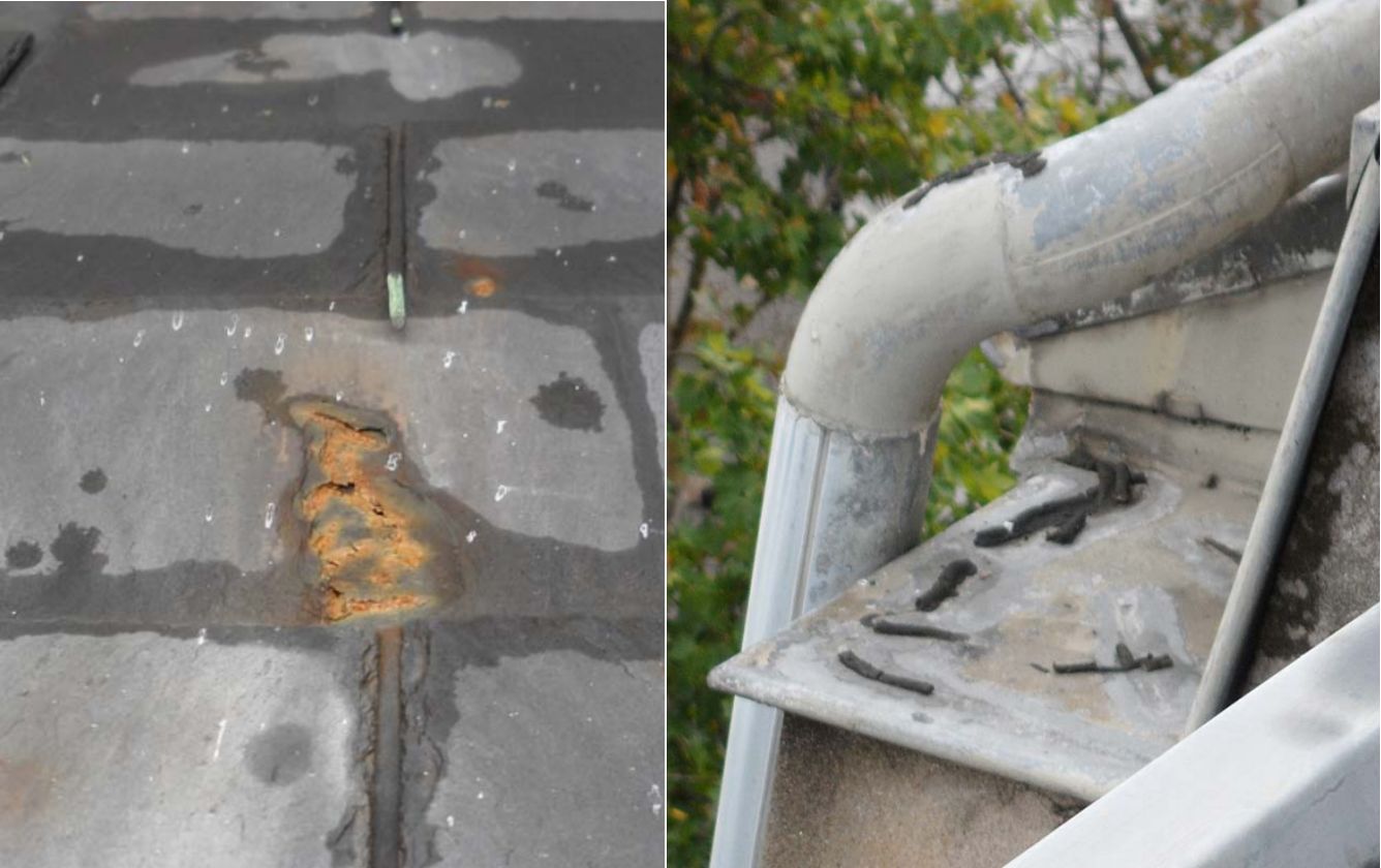 4. Fientes ayant détruit des ardoises sur le toit (à gauche) / Traces de piques anti-pigeons aujourd’hui tombées (à droite) (Messieux, 2008)