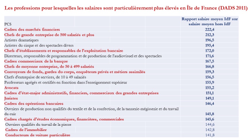 Figure 1. Les professions connaissant d’importants différentiels de salaire entre l’Île de France et la moyenne française (source : DADS, 2011)
