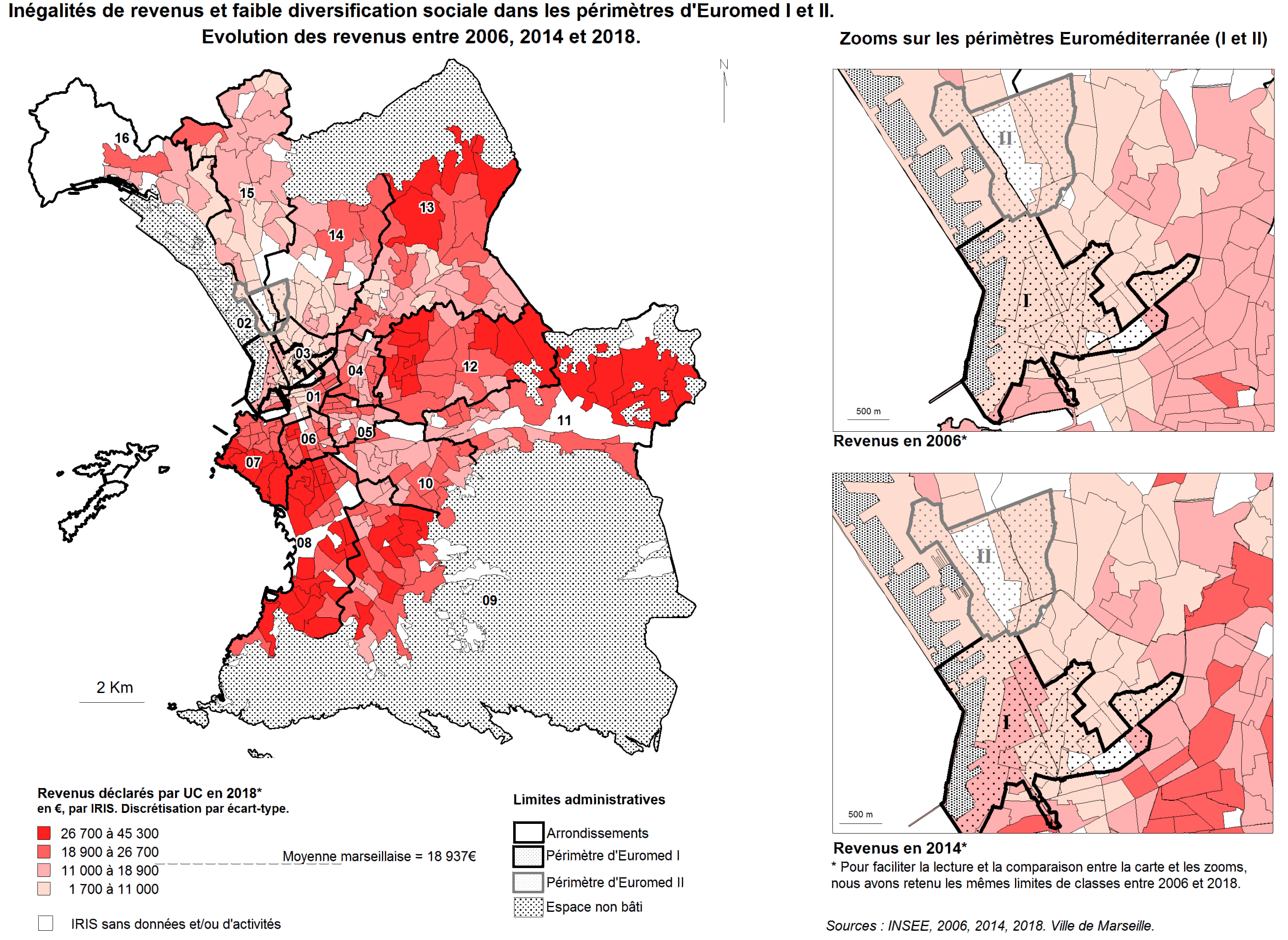 1. Inégalités de revenus à l’échelle de Marseille et précarité sociale des habitants d’Euroméditerranée (G. Audren, 2021)
