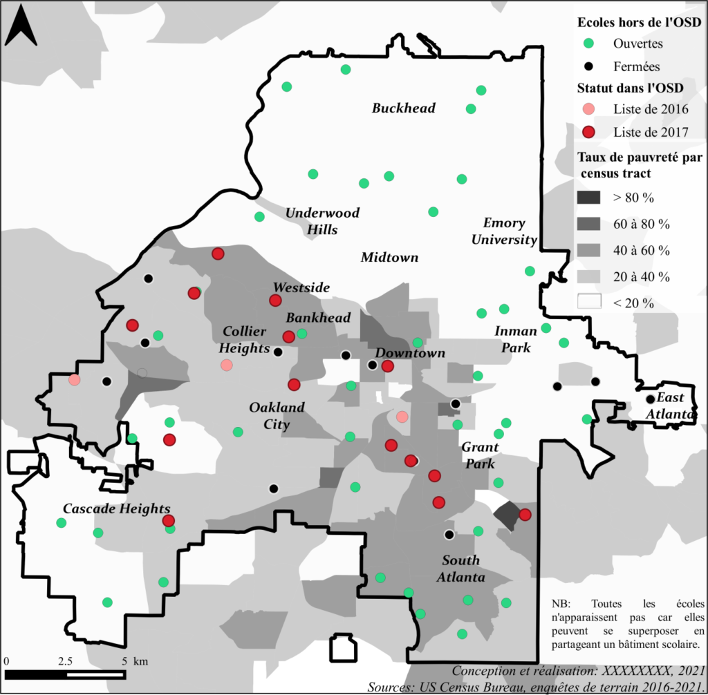 La géographie des écoles à Atlanta suit les lignes socio-économiques de la ville (fig.1). Une diagonale nord-ouest/sud-est peut être tracée, plaçant au nord les quartiers aisés et blancs de la ville (notamment Buckhead), et au sud les quartiers afro-américains et pauvres, à l’exception de certains quartiers de classe moyenne ou classes supérieures afro-américaines aux limites municipales sud-ouest (Cascade Heights par exemple). Le long de cette diagonale se trouvent des quartiers en cours de gentrification liés à un réinvestissement des centres dans une ville très peu dense et des aménagements majeurs menés par la ville depuis les Jeux Olympiques de 1996 (Westside, Midtown, Inman Park, Grant Park). Les écoles ciblées par la liste du gouverneur se situent exclusivement au sud de cette diagonale dans les quartiers les plus déshérités (désertification des services publics, taux très élevés de vacance résidentielle, absence d’activités économiques…).