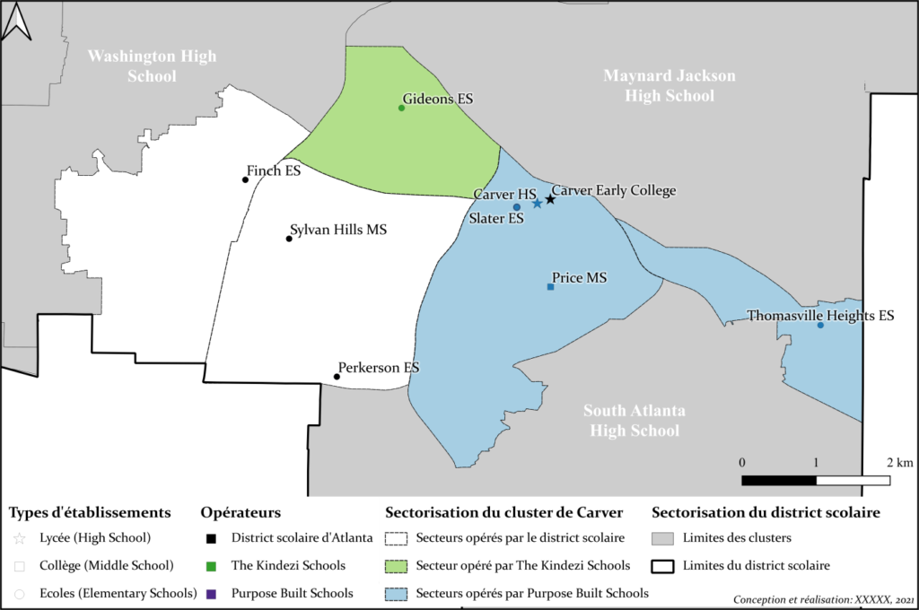 La seconde organisation, Purpose Built Schools (PBS), opère à Atlanta l’école Drew Charter Schools depuis 2000. Cette première école est créée par la fondation Purpose Built Communities (PBC) avant même la création de PBS en 2002. Elle est régulièrement classée comme école la plus performante de Géorgie. Située dans le quartier d’East Lake à Atlanta, elle est l’expérience locale qui sert de modèle. Les logements sociaux y sont démolis au début des années 2000 par le groupe PBC qui entreprend la construction de logements assurant une mixité (de revenus et de types de locations), ainsi que de commerces et d’une école charter. Cette expérience a été vivement critiquée et relève d’un processus de gentrification : les anciens résidents ont été délogés et remplacés par des ménages plus aisés (Boston, 2005 ; Slyke et Newman, 2006). Le district scolaire a proposé à PBS d’opérer de nouvelles écoles élémentaires dans le cluster du lycée Carver où se situent les écoles les moins performantes de la ville (fig. 2). PBS a accepté sous réserve de gérer également le collège et une partie du lycée, la moins performante. La majeure partie du cluster aujourd’hui est ainsi opérée par ces organisations privées, sans qu’un choix d’écoles entièrement publiques ne soit plus disponible dans cette partie de la ville.