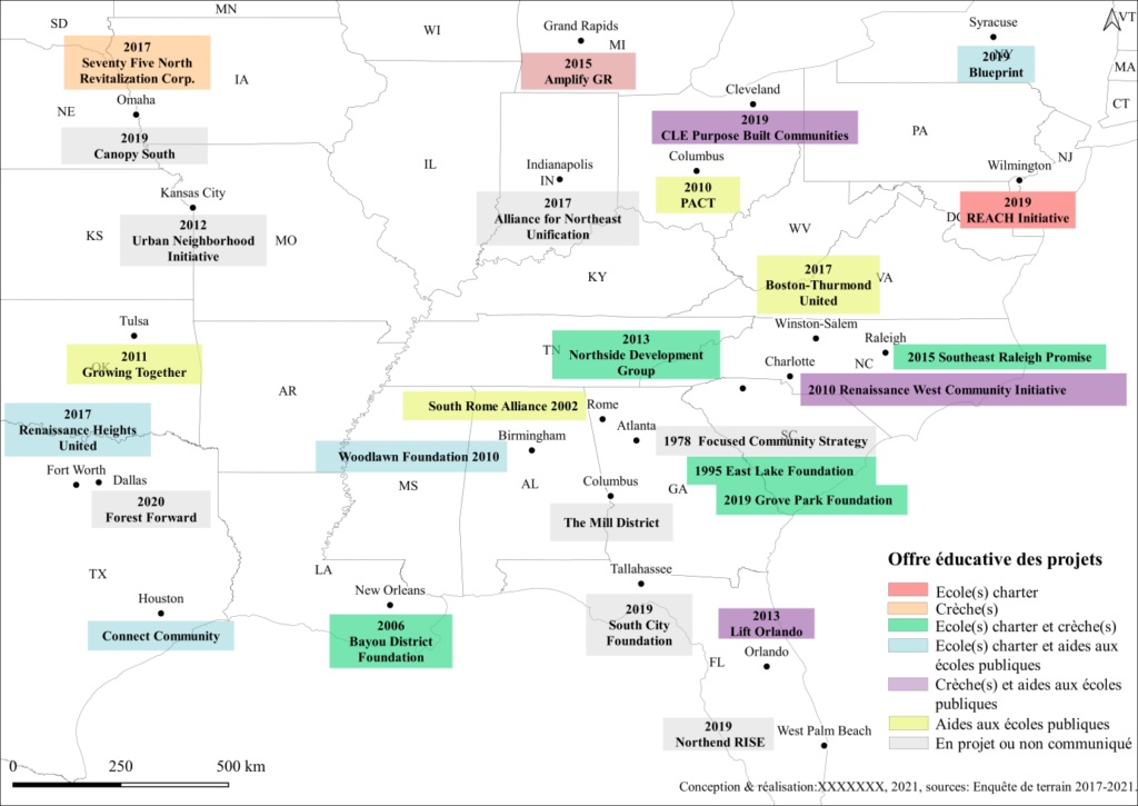 Ils sont présents dans 15 États, au Nord comme au Sud, mais absents des grandes métropoles du Nord (New York, Philadelphie, Boston, Chicago, Détroit…) où nombre de projets comme ceux présentés existent mais sous d’autres modalités. Le réseau s’appuie à chaque fois sur un partenariat avec une organisation pilote, dédiée à un quartier. Quelques partenariats sont bâtis avec des organisations précédant l’arrivée de PBC, à l’exemple de Focused Strategies Community à Atlanta fondée en 1978 ou Renaissance West Community Iniative à Charlotte en Caroline du Nord plus récemment en 2010. L’étude des sites internet des organisations ainsi que de la presse permet de mettre en avant quelques tendances et de distinguer les catégories de partenariats. D’abord, PBC est partenaire d’organisations déjà présentes depuis longtemps, correspondant à des organisations communautaires de quartier. Plus récemment, ces organisations ont soit été transformées, soit intégrées à des projets de redéveloppement urbain associant d’autres actrices et acteurs (municipalités, développeurs immobiliers, fondations philanthropiques). Ensuite, la seconde catégorie de partenariats concerne des organisations plus récentes, souvent choisies à la suite d’un appel à projet de PBC dans le cadre du redéveloppement de quartiers urbains défavorisés. Il s’agit principalement des partenariats développés à partir de 2015.