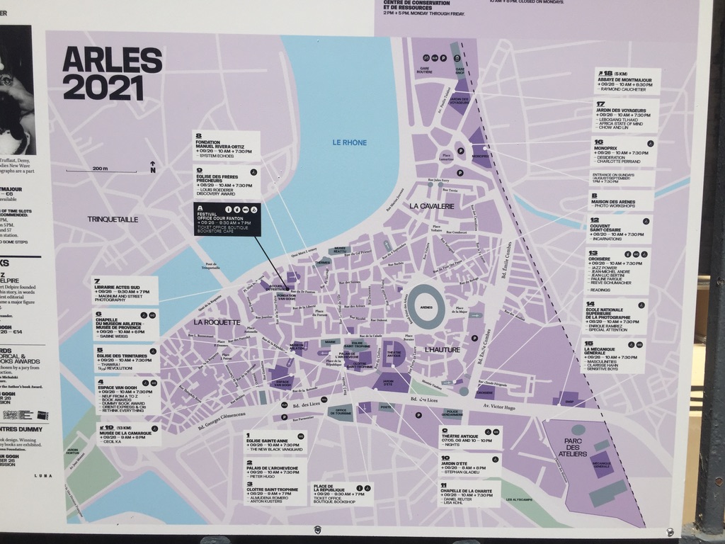 Cet accès à des lieux à l’architecture somptueuse, aux volumes imposants, offre de la malléabilité dans les propositions artistiques et scénographiques, à distance de la standardisation des lieux d’exposition (type white cube)5. L’ancrage du festival dans la ville s’opère principalement à l’échelle du centre ancien, avec une croissance mesurée au-delà (le Monoprix et Ground control au nord, Croisière et le parc des Ateliers à l’est) témoigne des transformations du territoire, notamment une forte désindustrialisation, qui laissera des vides réoccupés à mesure que le tourisme et la culture gagnent en puissance dans les années 2010, mais qui contractent les espaces disponibles tout en augmentant leur valeur. Les Rencontres – qui ne louent pas d’espaces – évoluent sur un territoire dorénavant prisé.