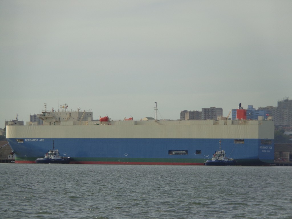 3. Vue sur les quais du terminal à voiture. L’arrivée d’un car carrier, escorté par deux remorqueurs, dans le port de Maputo, au pied des tours de la baixa (ville basse). Photo prise depuis Catembe, sur la rive droite (M-A Lamy-Giner, avril 2014).