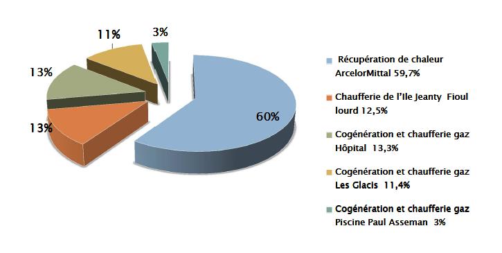 Cette source industrielle permet de fournir entre 60 et 70 % de la chaleur distribuée par le réseau urbain, le reste étant produit par des chaufferies fonctionnant au gaz ou au fioul lourd, certaines fournissant également de l’électricité par un processus de cogénération. La figure 2 présente la distribution spatiale des tuyaux, la localisation du point principal de production, c’est-à-dire des installations d’ArcelorMittal et celle des chaufferies produisant l’appoint, tandis que la figure 3 représente la répartition des différentes sources dans le mix énergétique du réseau en 2011.