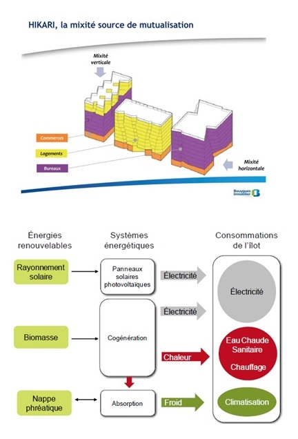 L’une des opérations qui constituent le partenariat consiste en la construction d’un « îlot à énergie positive », au nom commercial d’Hikari, donné par son promoteur Bouygues Immobilier et dont la construction est actuellement en cours d’achèvement (voir photo de couverture). L’objectif de l’opération est donc de parvenir à un ensemble de bâtiments qui produisent localement davantage d’énergie qu’ils n’en consomment, le bilan des productions et des consommations étant réalisé sur la durée d’une année.