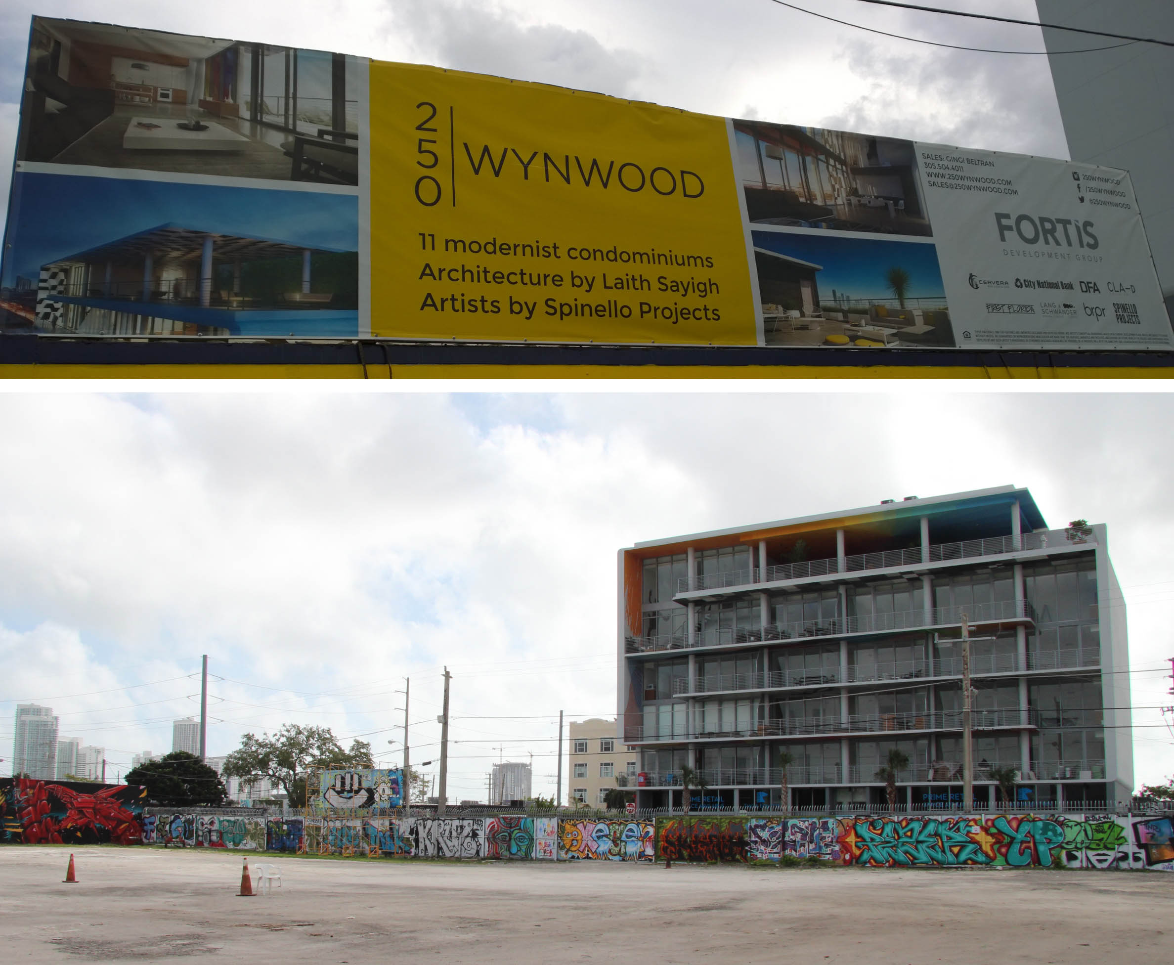13. D’un mur l’autre (NW 2nd Avenue) (Delage, mars 2014) : non seulement les nouveaux projets dépècent littéralement les murals préexistants, mais en plus les visuels de promotion n’y font pas référence, au profit d’images standards de quartiers commerçants.