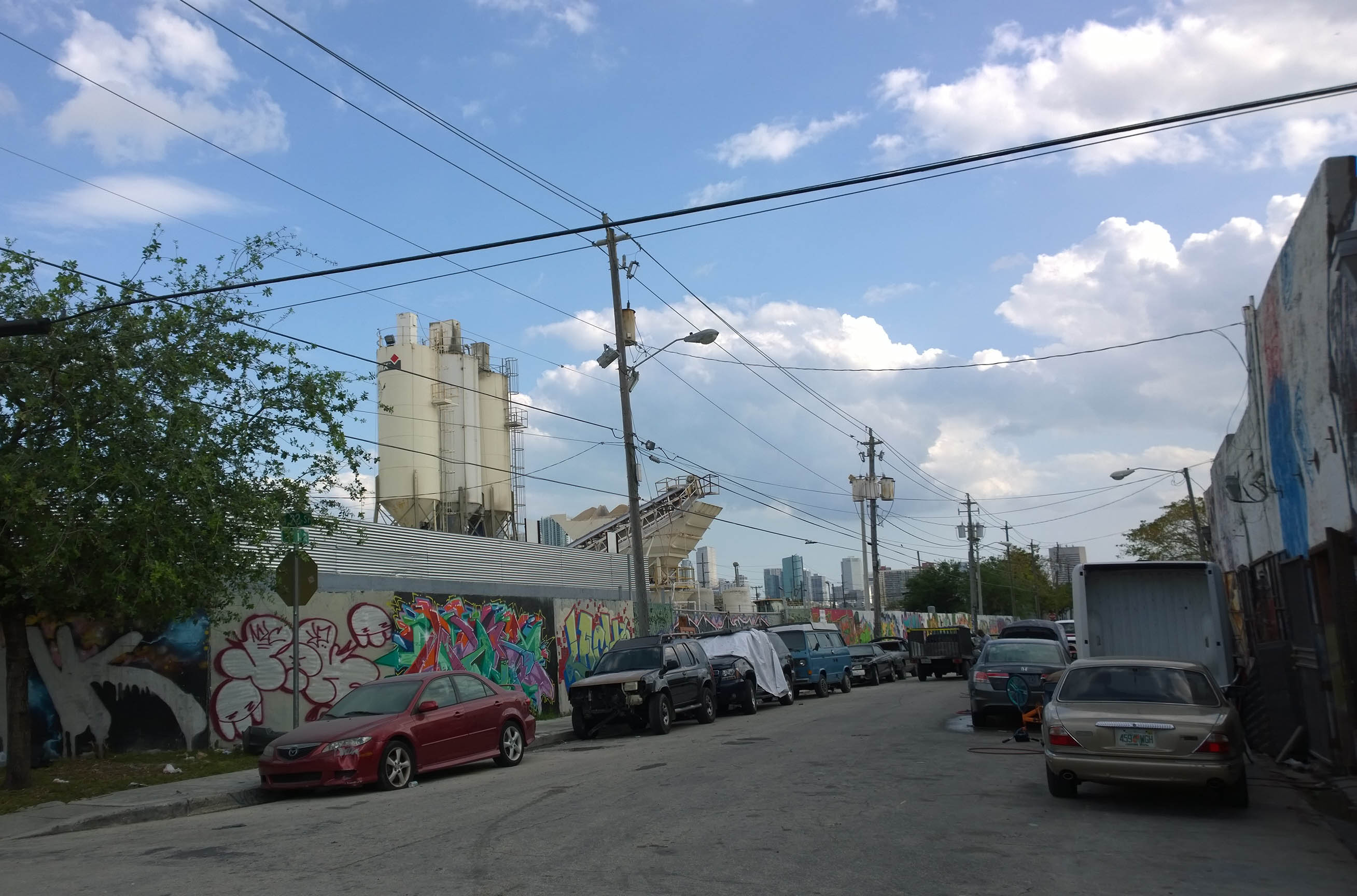 15. Le « front de muralisation » (22nd Street / NW 1st Place) (Delage, mars 2014) : Une cimenterie encore en activité, dont le mur de clôture est tagué d’artistes certainement moins réputés que dans l’avenue principale (par exemple, ils ne sont pas répertoriés dans les guides artistiques de Wynwood).