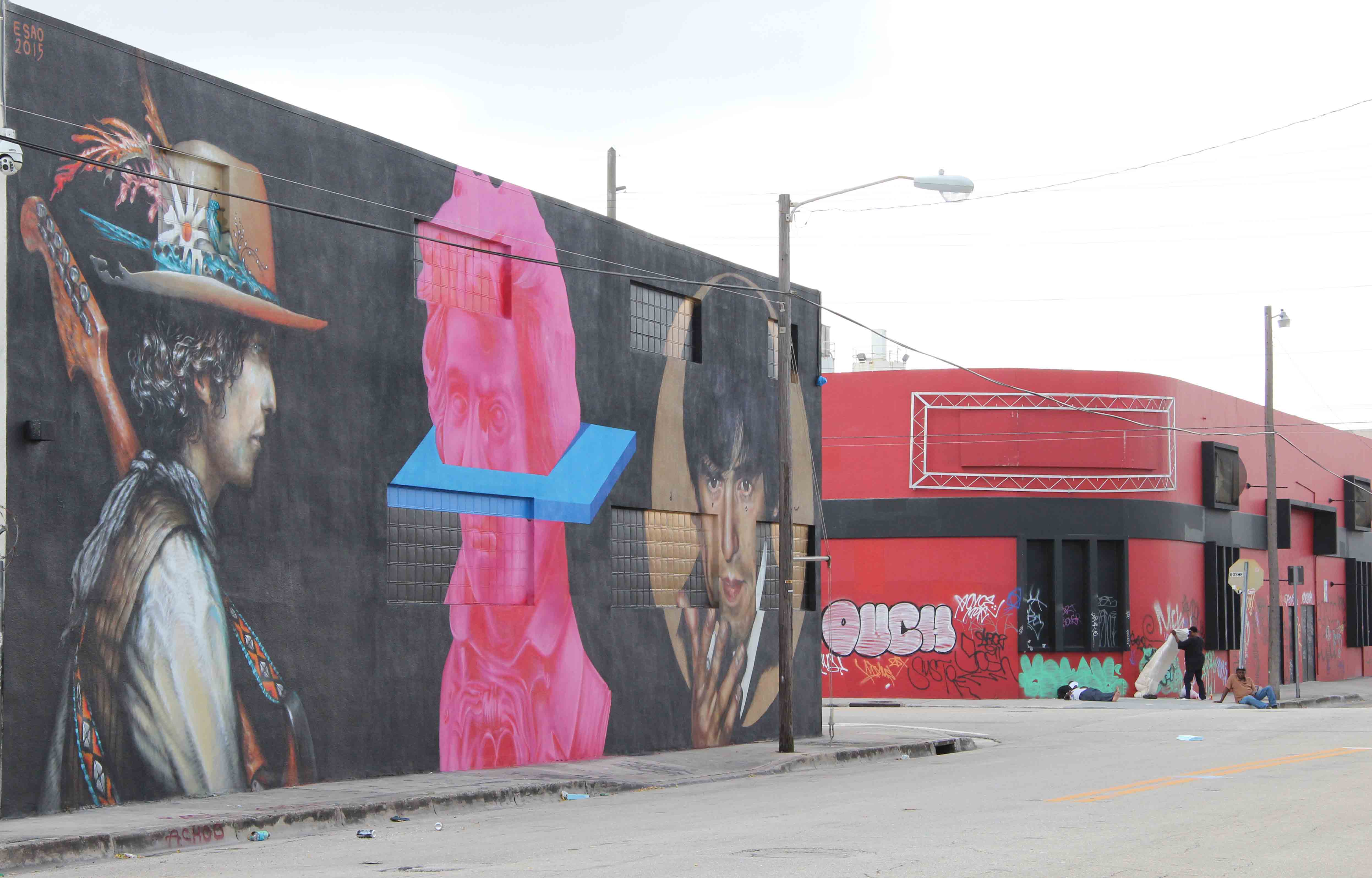 2. L’artère principale de Wynwood (NW 2nd avenue) (Delage, décembre 2015). Les façades de l’épine dorsale du quartier sont quasiment intégralement recouvertes de murals, pérennes pour certains (celui des artistes brésiliens Os Gemeos à gauche, date de 2011), d’autres changent régulièrement (celui au premier plan date de 2014).