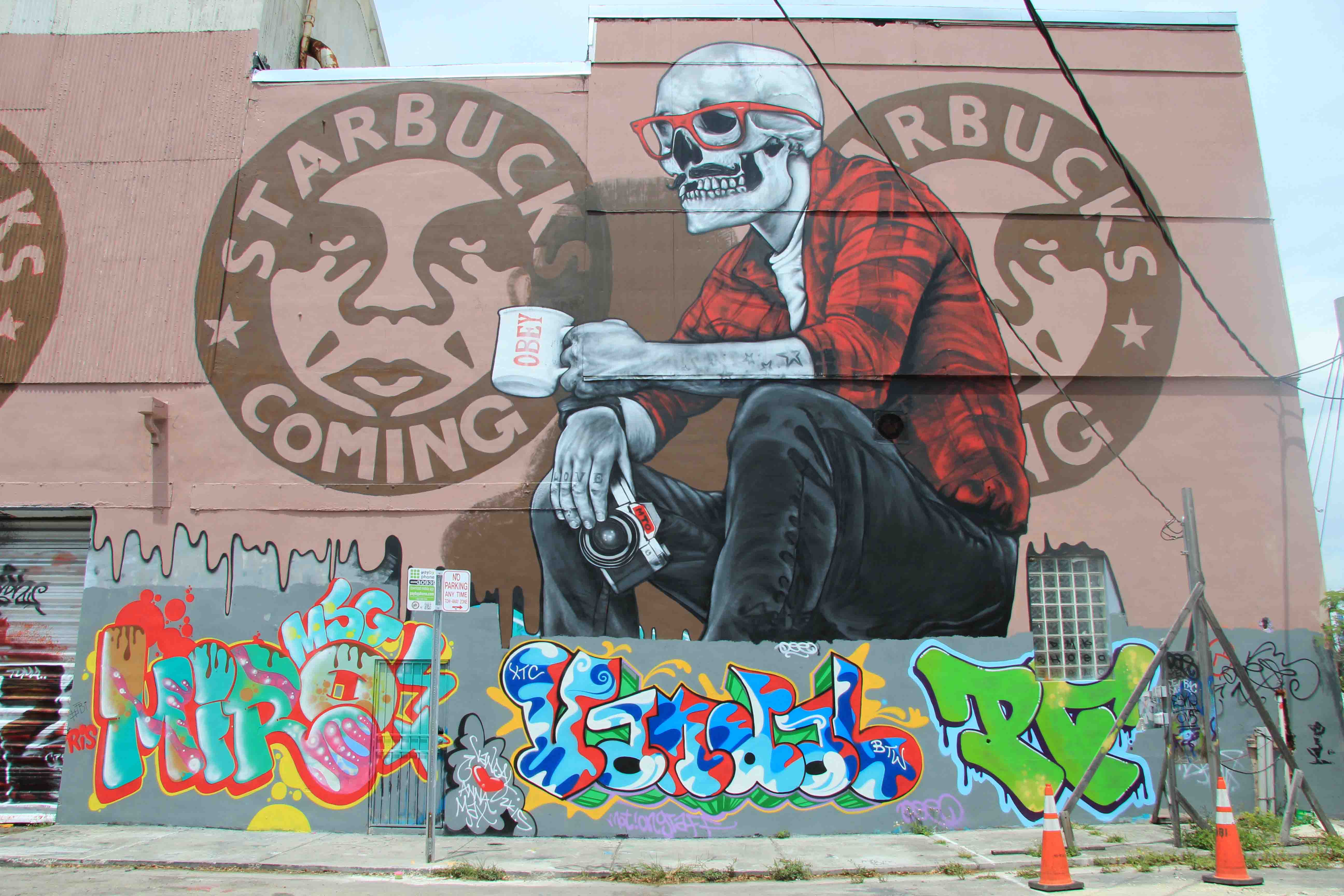 19. La Muerte del Barrio (NE 24st Street) (A. Delage, avril 2015) : « La mort du quartier », une critique de la gentrification / « artification » de Wynwood, quartier historiquement latino. Ce mural se situe à l’écart du cœur névralgique de Wynwood, dans une impasse près de la voie ferrée – moins visible, sa durée de vie sera peut-être plus longue. L’artiste européen MTO (signature sur l’appareil photo), connu pour cultiver le secret sur sa personne, critique ici ouvertement les nouveaux visiteurs du quartier, ainsi que Shepard Fairey, street artist fort médiatique qui a contribué à l’essor de Wynwood Walls (voir photo 8). D’une part, le personnage principal reprend tous les éléments représentatifs du « hipster », que ce soient ses codes vestimentaires ou ses habitudes sociologiques supposées (goût du café à emporter, des appareils photo reflex « vintage »). Graphiquement, la référence à Shepard Fairey est évidente non seulement dans le logo détourné de Starbucks, mais aussi sur le mug qu’il tient à la main : la Vénus représentant traditionnellement la firme de café est remplacée par André the Giant, l’image stylisée du catcheur qui a fait la célébrité de Shepard Fairey avec le slogan « Obey Giant », décliné en de nombreux produits dérivés.