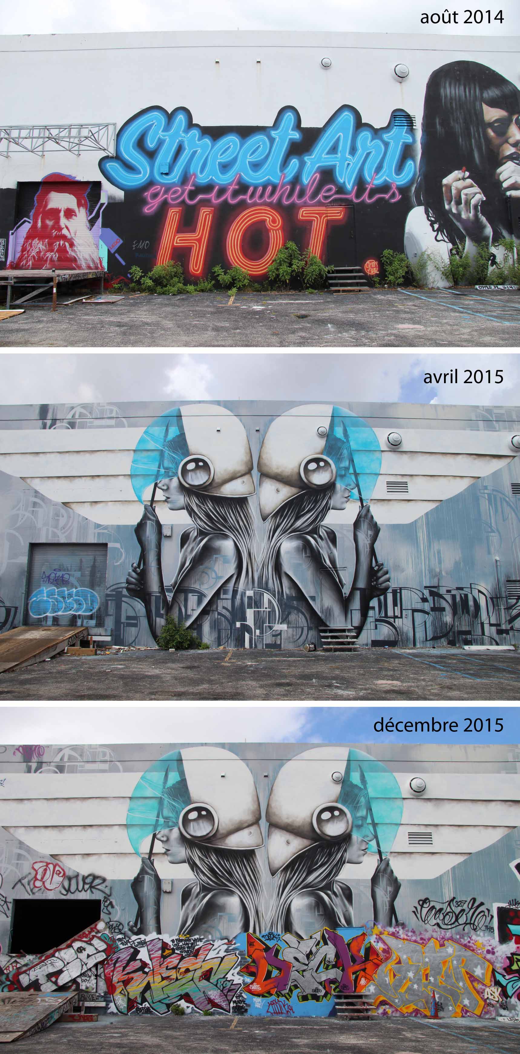 Les murs sont vivants et changent d’une année sur l’autre, notamment en décembre de chaque année avant Art Basel Miami : certaines fresques, aussi imposantes soient-elles, disparaissent totalement ou partiellement des murs devenus palimpsestes urbains (photo 4). Les temporalités évènementielles de la ville participent donc d’une périodicité des murals qui incite les visiteurs à revenir régulièrement. L’avantage économique est double : cela permet d’exposer davantage d’artistes, mais aussi d’attirer les mêmes visiteurs plusieurs fois.