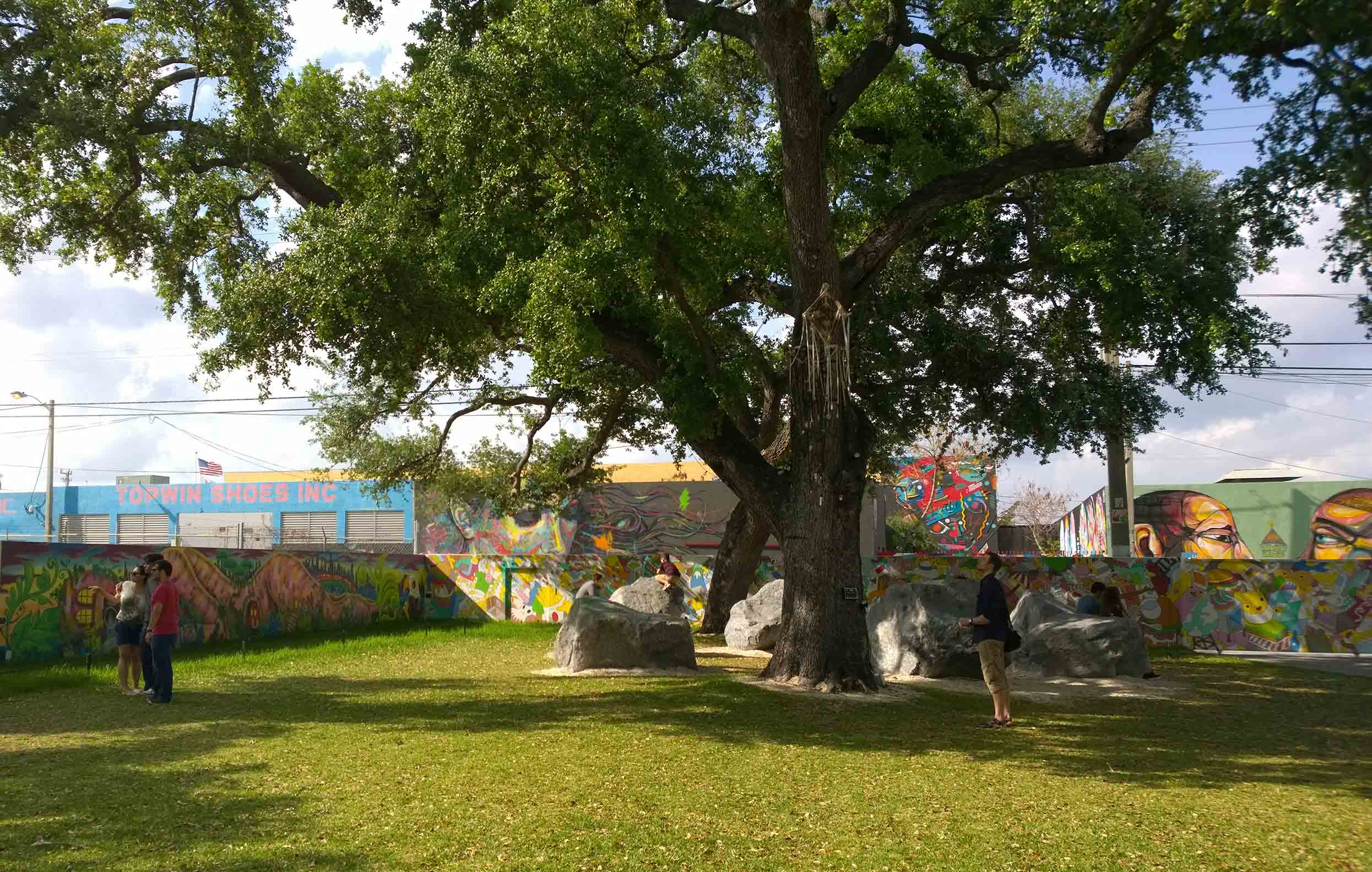 « Wynwood Walls », au cœur du quartier, est l’un des fers de lance de la renaissance du secteur (photos 8, 9). Inaugurée en 2009 par le fondateur de Goldman Properties, Tony Goldman (1943-2012), c’est une galerie à ciel ouvert d’œuvres d’artistes réputés, parfois protégées par une corde et accompagnées d’un cartouche. Alors que les murals dans la rue sont soumis aux aléas du renouvellement annuel lié à Art Basel, ceux-là sont institutionnalisés, ceints de grilles fermées la nuit.