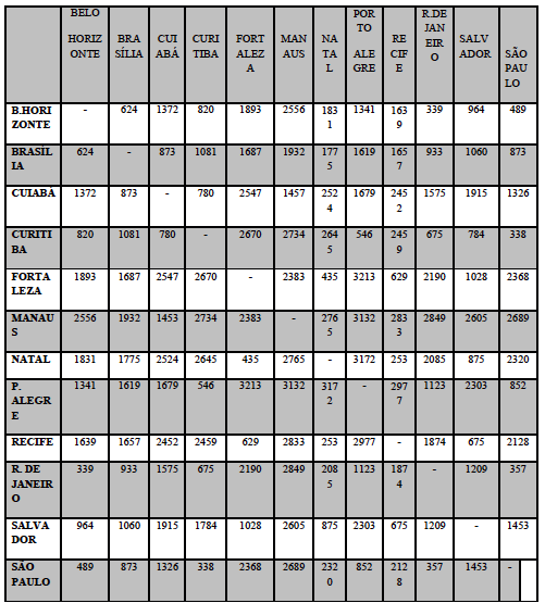 Brésil : distance entre les villes d´accueil des matches de la Coupe du monde de 2014 (en km) (Elaboration : ECOHabitat/Aiade Guerra, à partir des sources du tableau Distances entre les principales capitales brésiliennes, http://www.goodway.com.br/distancias.htm)