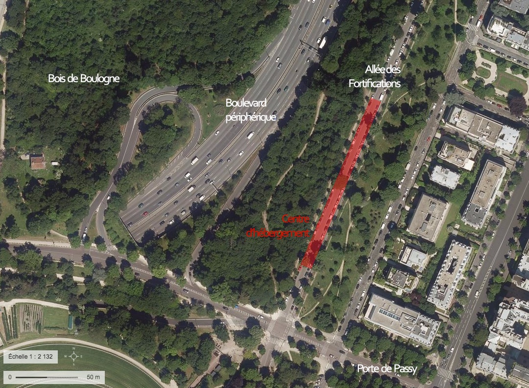 Les sites temporairement vacants ne pouvant ainsi être une réponse complètement satisfaisante, l’hébergement d’urgence se développe également à Paris sur des terrains non constructibles, immédiatement mobilisables. Ces sites permettent d’éviter à la fois la concurrence du marché et celle de la programmation urbaine future, c’est-à-dire de contourner la pression foncière parisienne en utilisant le foncier a priori3 inexploitable. C’est le cas du centre d’hébergement de l’Allée des Fortifications, installé sur un terrain appartenant à la Ville de Paris, sur une chaussée classée en zone urbaine verte4 par le PLU (Plan Local d’Urbanisme) de Paris5. L’utilisation de tels sites est permise par un contournement légal de la règle d’urbanisme et par le développement d’un modèle architectural ad hoc.