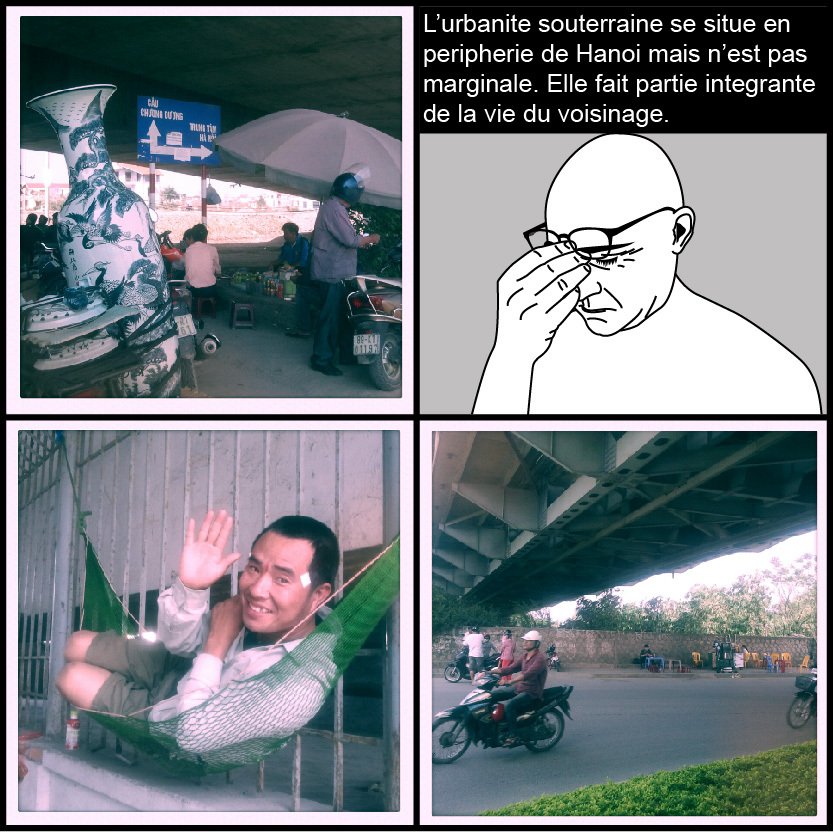 L’urbanité souterraine, même si marginale, fait partie intégrante de la vie sociale Hanoïenne, elle la prolonge d’une part dans la forme, en répétant les même dispositifs improvisés dans la capitale et d’autre part, dans l’espace, avec un développement urbain qui donne un exemple de la ville sans fin où la périphérie disparait dans un flou d’agglomérations anonymes. Ce cadre souterrain devient un espace public organisé par le voisinage. Un refuge.