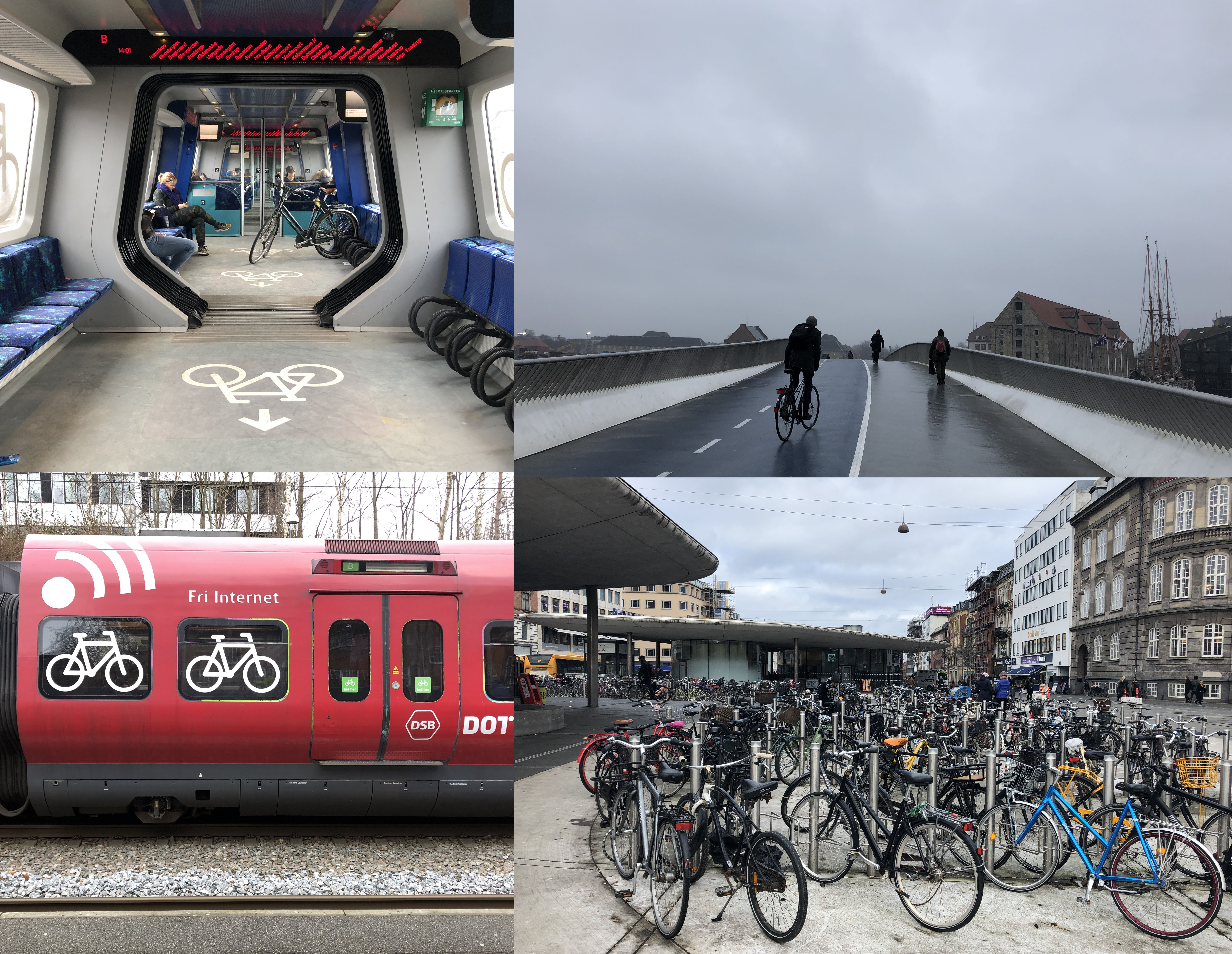1. À Copenhague, des infrastructures qui encouragent les mobilités douces, des s-tøg (trains régionaux) à l’aménagement des espaces publics (parvis de la gare de Nørreport en bas, Inderhavnbroen en haut). (Duc, 2019).