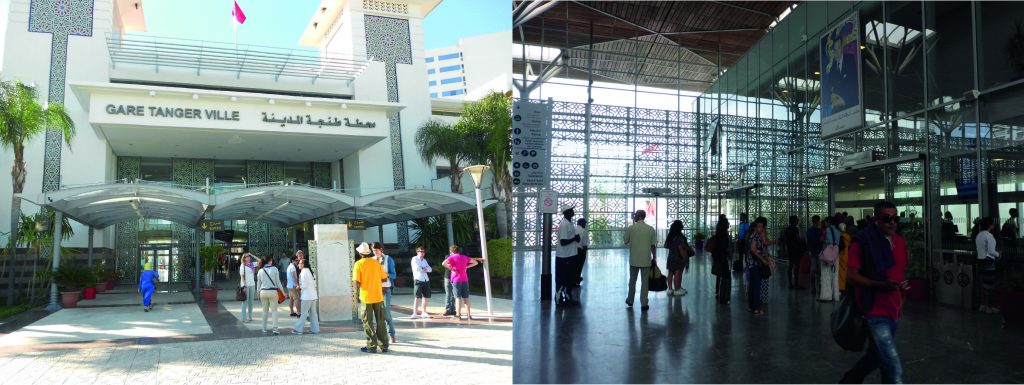 Que ce soit dans le nord du Maroc, pour l’ensemble du pays ou au niveau international, la ville de Tanger développe une polarité particulière. Le projet de Tanger-Med participe aux reconfigurations urbaines et régionales. Il s’accompagne de la mise en œuvre, dans cette cité de longue date tournée vers le monde (statut de zone internationale de 1923 à 1958), d’un type particulier de métropolisation. Le déplacement du port de commerce à 40 kilomètres du centre-ville a entraîné un ensemble de transformations urbaines : le remblai est terminé, les navires de croisière y font escale, des tours et hôtels modernes sortent de terre, la gare TGV est prête. La ligne à grande vitesse, inaugurée en novembre 2018, est gérée par l’ONCF et relie Tanger à Rabat et Casablanca (cf. photographies 1) (Baron, 2017). Elle participe au renforcement multimodal d’un axe urbain, littoral et national. Les acteurs du secteur marchand rencontrés espèrent que le fonctionnement à grande vitesse libérera des sillons pour l’acheminement du fret interurbain entre Tanger et Casablanca. En effet, avec Tanger-Med, la capitale du Nord est devenue une zone d’ancrage de différentes multinationales, en particulier du secteur de la grande distribution, qui utilisent le port et ses zones franches comme plate-forme de redistribution nationale et internationale, renforçant ainsi les circulations sur l’axe littoral jusqu’à Casablanca et au-delà.