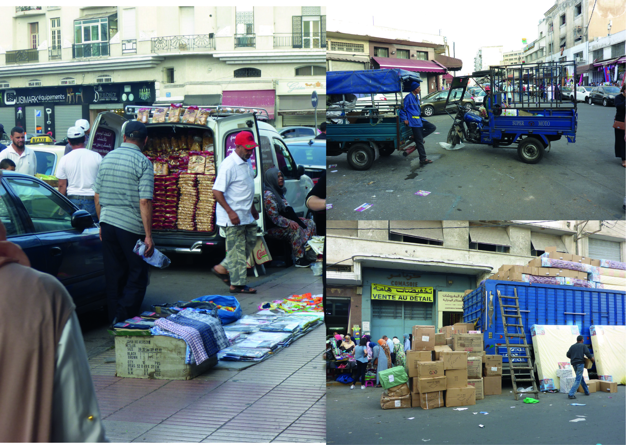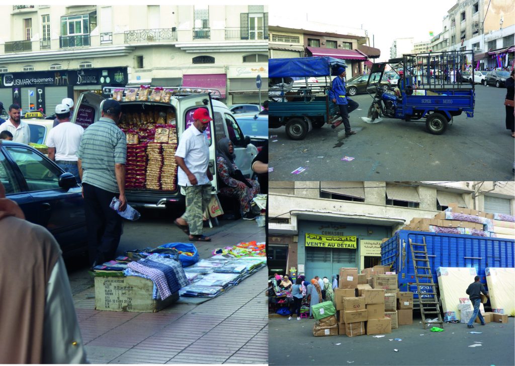 Le lien entre quartiers commerçants et flux d’échanges internationaux, matérialisé par la circulation incessante de personnes et de véhicules, est assuré par les commerçants étrangers présents à Derb Omar (Sénégalais, Ivoiriens), colporteurs écoulant tissus, fripes, chaussures et autres bijoux auprès des clients des dépôts (parfois eux-mêmes revendeurs). La marchandise arrive par camionnettes des pays d’origine, elle est déchargée dans les quartiers de résidence des commerçants, mais aussi non loin de Derb Omar, sur un parking longeant l’entrée de la médina, près du marché dit « des Sénégalais ». Là se tient en attente une dizaine de véhicules de 3,5 tonnes, opérant entre Casablanca et Dakar, parfois Bamako ou Abidjan : ils transportent à l’aller des produits dérivés de l’argan et des maroquineries, au retour des tissus, des meubles, des bijoux de pacotille ; parfois s’y ajoutent des commerçants eux-mêmes. Le trajet entre le Maroc et le Sénégal prend cinq jours, vers Abidjan entre huit et dix jours.
