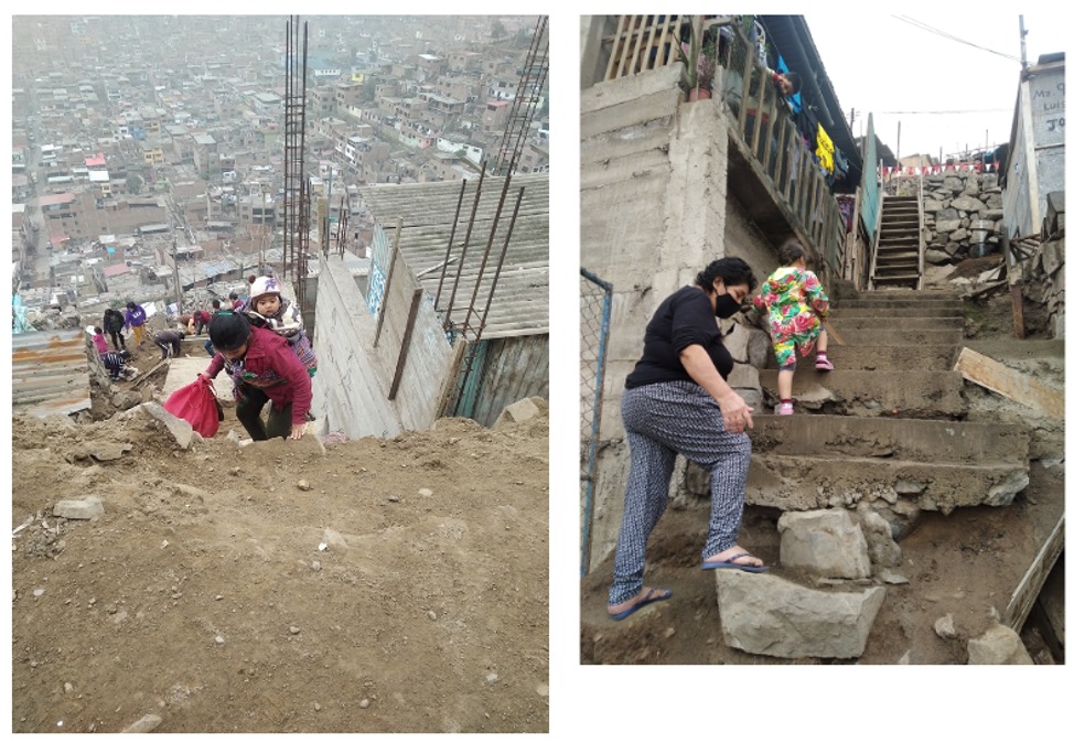 14. Dans le district d’Independencia, en périphérie de Lima, les escaliers – aménagements indispensables aux déplacements quotidiens dans ce quartier à la topographie accidentée – sont le plus souvent discontinus, mettant en danger les habitants dans leurs cheminements quotidiens (Román García, ANR Modural, 2021).