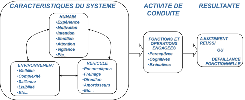 Il en est ainsi de l’activité de déplacement qui confronte souvent les usagers à des situations variables et complexes face auxquelles ils ont à ajuster leur analyse et leur comportement, ce à quoi ils parviennent le plus souvent par le recours à leurs fonctions perceptives, cognitives et exécutives (figure 2). Mais il peut arriver que les caractéristiques du système Humain/Véhicule/Environnement soient telles qu’elles dépassent les fonctions habituellement efficaces, et aboutissent à un échec adaptatif que l’on qualifiera de « défaillance fonctionnelle »2. De la même manière que chaque accident est un événement multifactoriel, la défaillance fonctionnelle résultera, sauf exception, de la conjugaison de plusieurs facteurs correspondant à des états non optimaux des composants du système concerné.