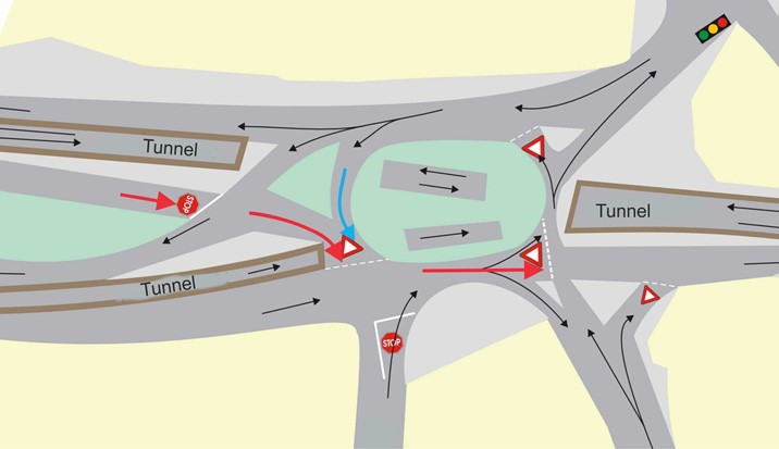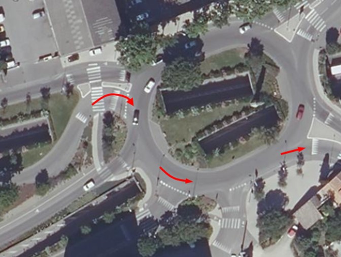 D’autres accidents survenaient par ailleurs dans cette infrastructure compliquée et équivoque : à l’endroit du stop (première flèche rouge sur la figure 5), où les conducteurs non familiers des lieux s’attendaient à voir arriver des véhicules de la droite plutôt que de la gauche en croisant cette voie à sens unique ; et à l’intersection suivante, où des conflits survenaient avec des véhicules qui rejoignaient cette même intersection par la voie de gauche en provenance de l’anneau (figure 5, flèche bleue). Face au caractère excessivement et répétitivement accidentogène de la zone, les services techniques ont fini par entreprendre la réfection de l’ensemble du carrefour et ont consulté à cette occasion notre laboratoire à titre de conseil. La figure 6 présente le résultat de ce remaniement sous la forme d’un carrefour giratoire qui intègre l’ensemble des voies d’approche sur un seul anneau, constituant une infrastructure beaucoup plus aisée à comprendre en supprimant notamment cette succession de pertes de priorité initiale, et clarifiant de fait les anticipations des usagers. Depuis ce remaniement, nos équipes d’astreinte ont été appelées une seule fois sur ces lieux mais les véhicules signalés accidentés par un appel téléphonique aux services de secours étaient déjà repartis à notre arrivée sur place, suggérant que seuls des accidents matériels ont pu s’y produire ces dernières années.