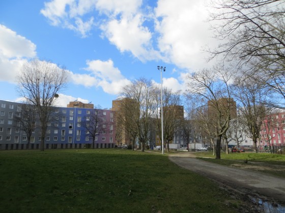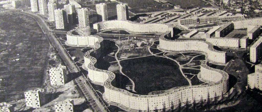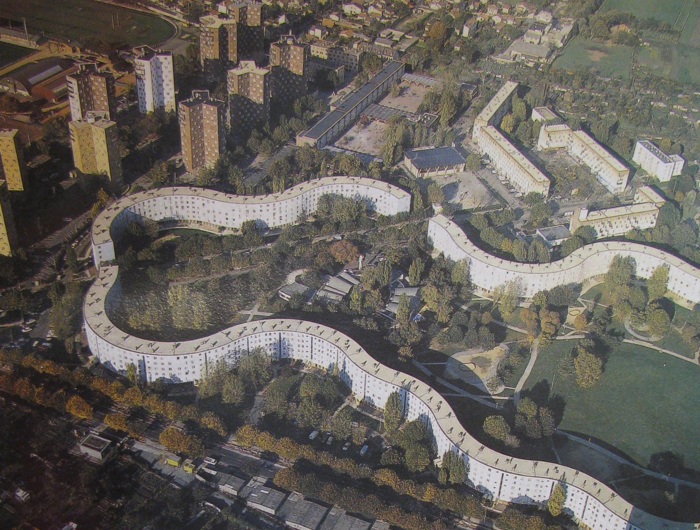 En 1951, Émile Aillaud, architecte, est nommé par l’Office public d’habitations de la Seine pour concevoir la cité-jardin du lieu-dit l’Abreuvoir à Bobigny, sur un terrain imbriqué dans le tissu urbain de la ville. Il forme une équipe avec Fabio Rieti, peintre. L’idée principale est de créer une prairie, au milieu d’un urbanisme pavillonnaire, entourée par des constructions basses de trois ou quatre étages et de six tours de onze étages de formes différentes. Cette coopération entre un architecte et un artiste a ajouté des couleurs à la forme du serpentin et des tours. Un paysage voulu par son concepteur, à la fois « frappant qui puisse agir sur l’imagination et l’affectivité des habitants » (Aillaud, n.d.), à travers lequel la cité-jardin traditionnelle est revisitée ; et « paraissant avoir existé avant la construction » (Landauer et Lefrancois, 2011 : 55).