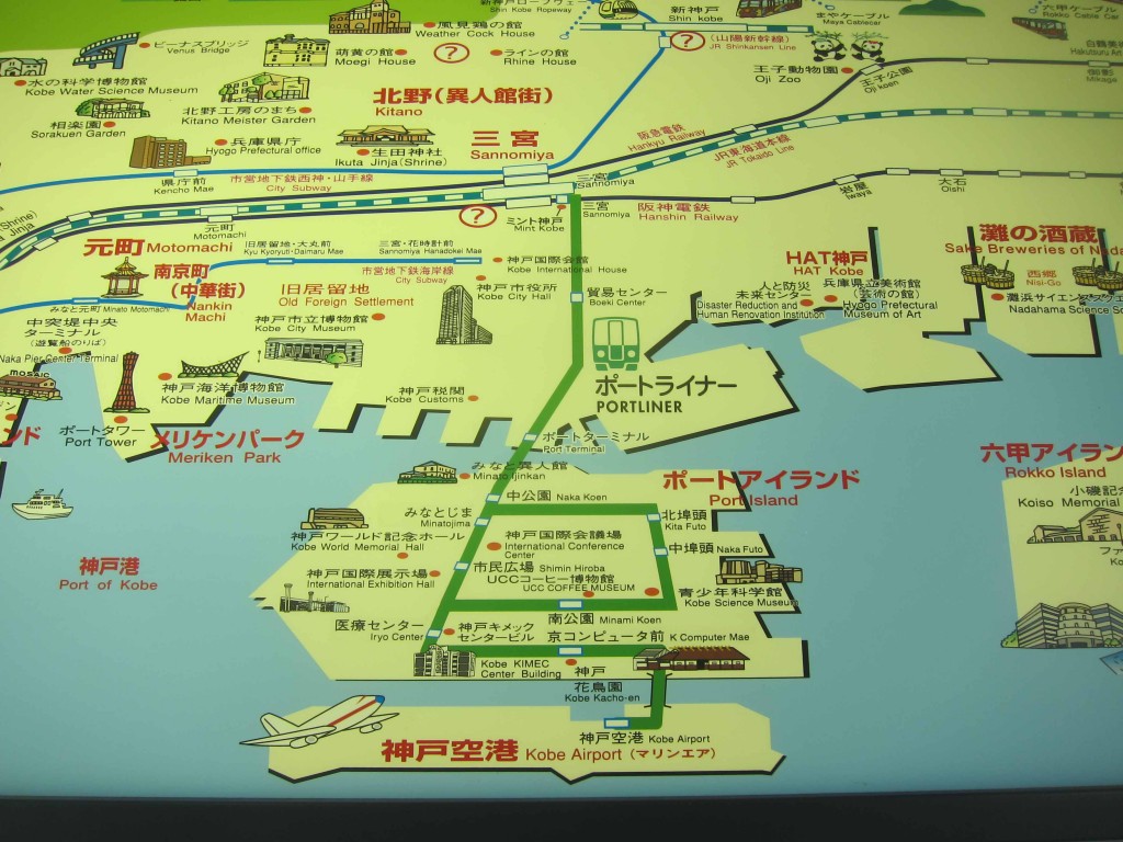 Si l’expansion portuaire du Japon s’est faite par des constructions de terre-plein industrialo-portuaires, c’est aujourd’hui l’ensemble des fonctions urbaines qui peut se retrouver sur l’eau. Kobe s’est dotée, comme Osaka (Kansai International Airport, KIX), Kitakyushu et Nagoya (Chubu Centrair) d’un aéroport en pleine baie, mais les terre-pleins en avant du rivage sont aussi des morceaux de ville. Port Island a été construite entre 1966 et 1981. Le pourtour de l’île (523 hectares) est à vocation portuaire (terminaux à conteneurs) mais sa partie centrale est de caractère urbain (hôtels, centre de congrès, musée du café, magasin IKEA, plusieurs parcs). Juste à l’Est, l’île Rokko (1973-1992, 580 hectares) abrite de même hôtels, installations sportives, marchés, immeubles avec vue sur la mer, un parc d’attractions, le Musée de la Mode de Kobe, la Kobe International University, ainsi que des terminaux à conteneurs. Les systèmes de transport en commun à guidage automatisé « Port Liner » et « Rokko Liner » relient les deux îles à la gare de Sannomiya et à Kobe Airport pour l’un, et à la gare Sumiyoshi pour l’autre.