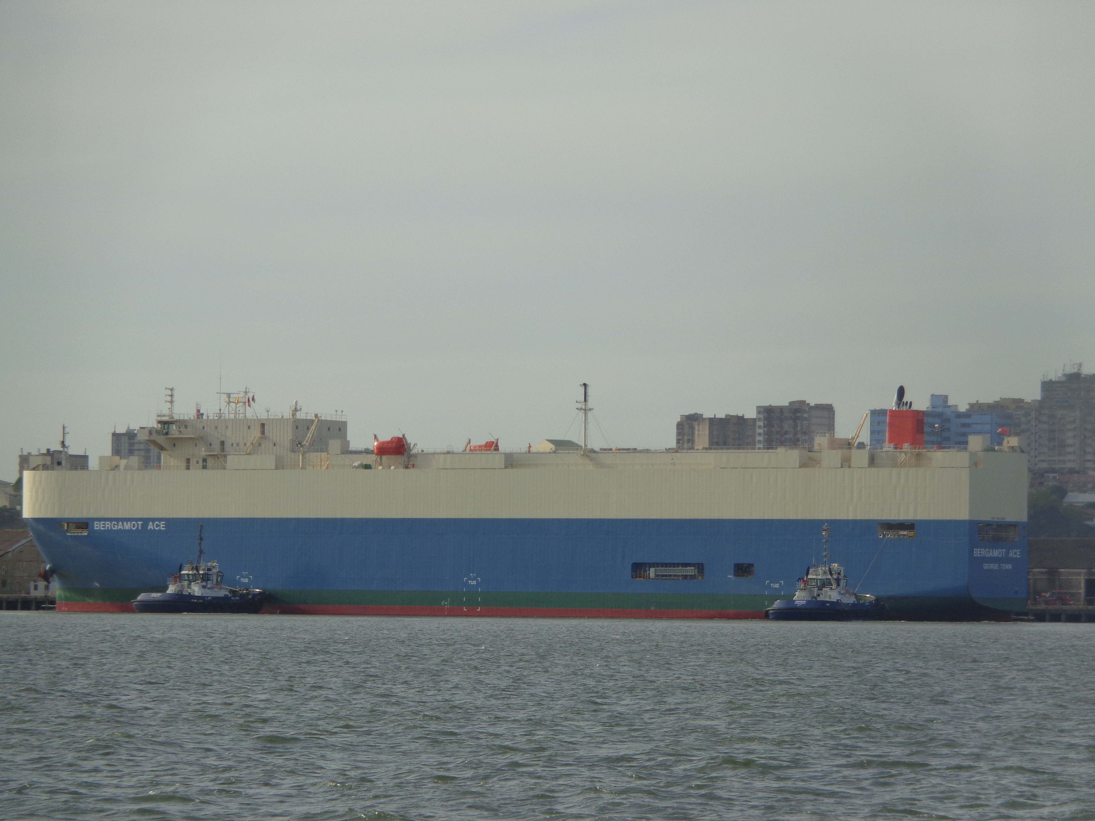3. Vue sur les quais du terminal à voiture. L’arrivée d’un car carrier, escorté par deux remorqueurs, dans le port de Maputo, au pied des tours de la baixa (ville basse). Photo prise depuis Catembe, sur la rive droite (M-A Lamy-Giner, avril 2014).