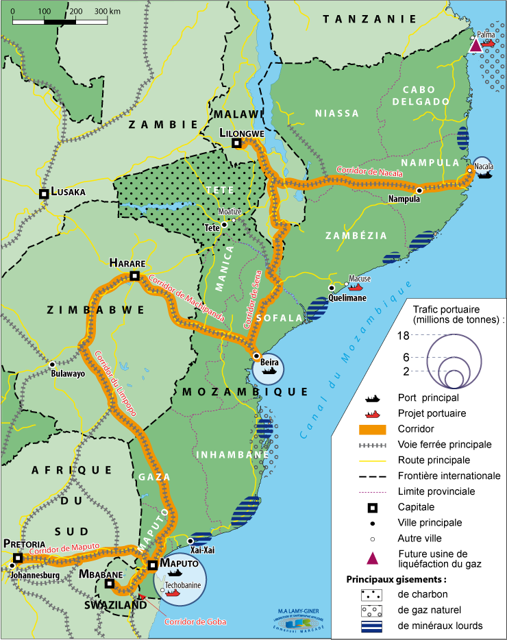 Les investisseurs étrangers tendent ainsi à suppléer un État dans l’incapacité financière d’engager de grands travaux de réhabilitation et de renforcement du réseau de communication. En y regardant de plus près, tous les axes majeurs mozambicains forment des pénétrantes latitudinales et jouent le rôle de trait d’union entre port et pays enclavés voisins. Comparativement, les axes Nord-Sud semblent dérisoires, même s’il existe une volonté gouvernementale d’améliorer ces liaisons (livraison d’un pont sur le Zambèze en 2009) et par là même gommer les disparités internes. L’absence d’un axe structurant Nord-Sud ajoute à la fragmentation du territoire. À l’heure de la ruée vers le gaz et le charbon, le manque d’infrastructures pénalise le pays. Par exemple, la faible capacité de la voie ferrée de Sena freine les exportations de charbon de la province de Tete ; le minerai noir s’entassant sur les lieux d’extraction. Pour résoudre le problème, la construction d’une nouvelle voie ferrée, courant entre les mines de Moatize et le port de Nacala, via le Malawi, a été entreprise par le groupe brésilien Vale.