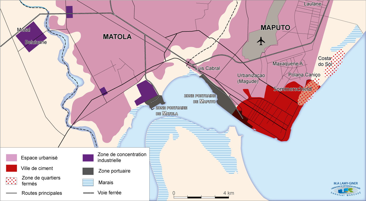 Au sommet de la hiérarchie urbaine nationale, Maputo qui occupe essentiellement la rive gauche de l’estuaire a fini par rejoindre dans son extension la ville voisine de Matola, avec laquelle elle forme une conurbation de 2 millions d’habitants. La ville abrite 25 % de la population urbaine totale du pays, en incluant Matola, devant Beira (530 000 habitants) et Nampula (388 000). Matola s’est métamorphosé, au cours des années 60, en satellite industriel de Maputo (Jenkins, 2000). La ville voisine est devenue le « déversoir » régional de l’exode rural alors que parallèlement elle a vu, à la suite d’inondations récurrentes (dont celle de l’année 2000), le relogement des habitants de Maputo, dont les habitations ont été détruites (quartiers de Louis Cabral, Polana Caniço A).