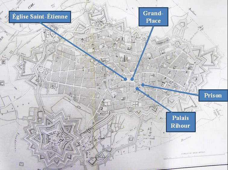 À Lille, donc, sous l’Ancien Régime, la plupart des exécutions se déroulaient sur la Grand-Place. Autour de cette place étaient aussi groupés les autres symboles de la justice : le tribunal était dans le Palais Rihour, une prison était au sud de la place et les condamnés y attendaient l’exécution de leur peine (Derasse, 2000 : 123-125) ; et l’amende honorable – c’est-à-dire la peine accompagnant parfois la peine de mort et consistant en un aveu public du crime et une demande de pardon à Dieu, au Roi et à la Justice, tête nue et à genoux (Muyart de Vouglans, 1780 : 67-68) – était faite devant l’église Saint-Étienne, au nord de la place (ADN 8B2 796). Aussi la Grand-Place était-elle l’espace de la justice.