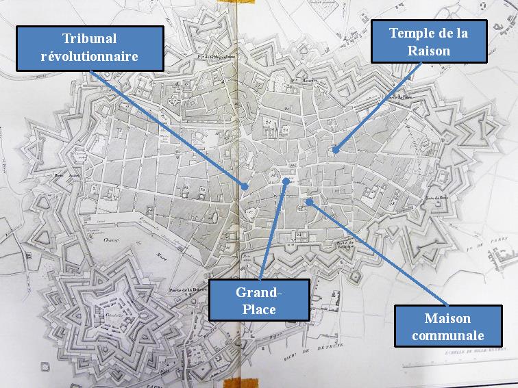 Toutefois, les valeurs révolutionnaires ont complètement changé la symbolique portée par la Grand-Place. En effet, les fêtes révolutionnaires pouvaient s’y dérouler et, par exemple, lors du projet de construction du Temple de la Raison, lieu du culte révolutionnaire, on a préféré utiliser l’ancienne église Saint-Étienne. Mais à la suite de la destruction de l’église par les bombardements autrichiens, il a été décidé d’utiliser l’église Saint-Maurice, qui se trouvait 300 mètres au sud de la Grand-Place (Trenard, 1987 ; Trenard et al., 1991 : 263, 269-270). Et pour la fête rendant hommage à l’Éternel, ordonné par le décret du 18 floréal de l’An II (7 mai 1793), un cortège jusqu’au Temple fut organisé. Cette concordance du lieu de l’exécution et de la fête révolutionnaire n’était, en fait, pas un hasard ; l’exécution de la peine et la fête partageaient le même caractère cérémoniel qui se nourrit de l’unité et l’unanimité (Ozouf, 1976 : 122 ; Girard, 2011). Ainsi durant la Révolution le lieu de l’exécution était toujours habillé par son importance symbolique depuis l’Ancien Régime.