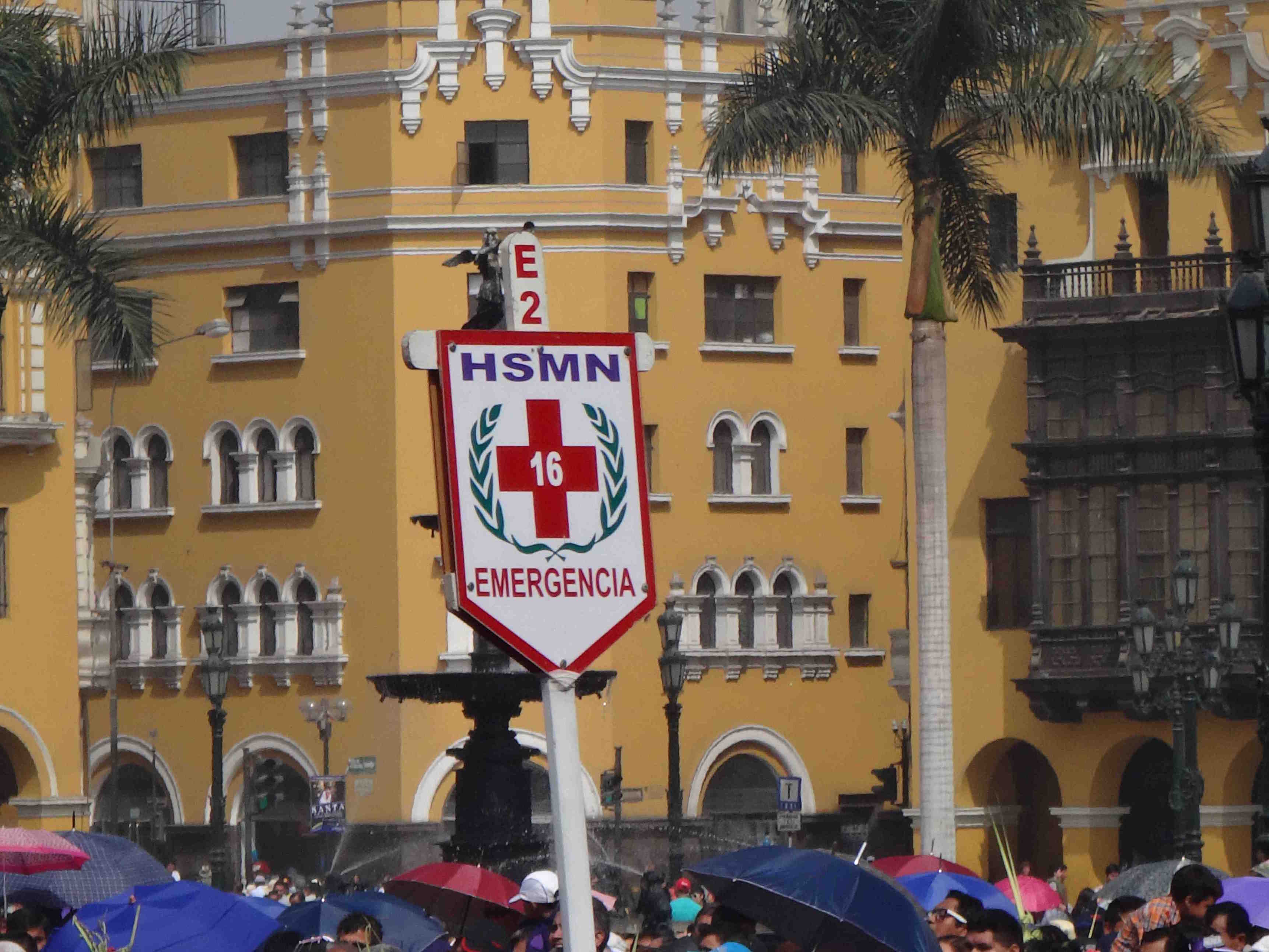 Figure 11. « Urgence », signe de la Confrérie du Seigneur des Miracles de las Nazarenas (HSMN), lors de l’arrivée de l’effigie à la Place d’Armes (Sierra, 2015). Emergencia est localement synonyme de crise dans le cas d’une catastrophe qui advient et requiert des secours.