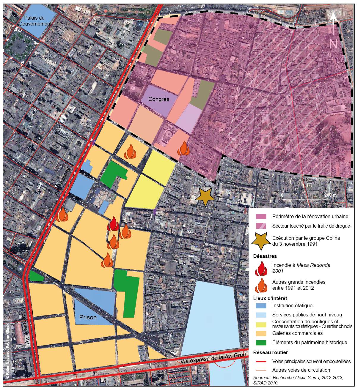 Barrios Altos est l’espace prioritaire d’application de la loi de rénovation urbaine de 2009. Espace de concentration des callejones et des quintas, il est l’espace châtié par excellence : il a connu l’abandon de la bourgeoisie partie vers le sud et le développement des taudis ; l’installation des trafics et des groupes de terroristes ; il a subi les foudres du pouvoir militaire ; les articles de presse le citent en priorité comme devant subir les destructions d’un séisme. C’est également un secteur qui concentre des activités marchandes qui, du fait des produits vendus (pétards, tissus, produits inflammables), et du non-respect des mesures de sécurité (extincteurs inaccessibles et non-entretenus, voies d’évacuation condamnées par crainte des vols), sont le foyer de plusieurs incendies (Sierra, 2013). Celui de Mesa Redonda fit 300 victimes en 2001. La rénovation urbaine s’y accompagne d’une réorganisation du commerce de rue et de son assignation dans de nouveaux lieux généralement fermés ainsi que de l’interdiction de certaines pratiques comme la circulation des mototaxis. C’est donc toute une vie citadine qui est visée. La priorité a été donnée à la partie nord de Barrios Altos, proche des lieux de pouvoir (Congrès, pouvoir judiciaire) et du marché central, avec le plus grand nombre de bâtiments anciens et significatifs de l’histoire créole de la capitale. Enfin, c’est la partie qui recèle les trafics et consommation de drogue (figure 9).