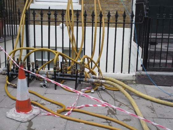 S’intéresser à l’arrivée du tuyau, c’est ici mettre en avant ce que Laure Criqui appelle « les entrailles » de la ville, ce qui est à la fois généralement invisible et essentiel au fonctionnement urbain, dans la lignée des travaux de Susan Leigh Star (Star, 1999). Le tuyau participe normalement d’une logique d’équipement, mais semble ici davantage relever d’une logique d’encombrement, empêchant les circulations au-dessus, empêché par les autres tuyaux en-dessous. L’installation du tuyau semble ainsi un défi quotidiennement répété à une planification bien ordonnée.