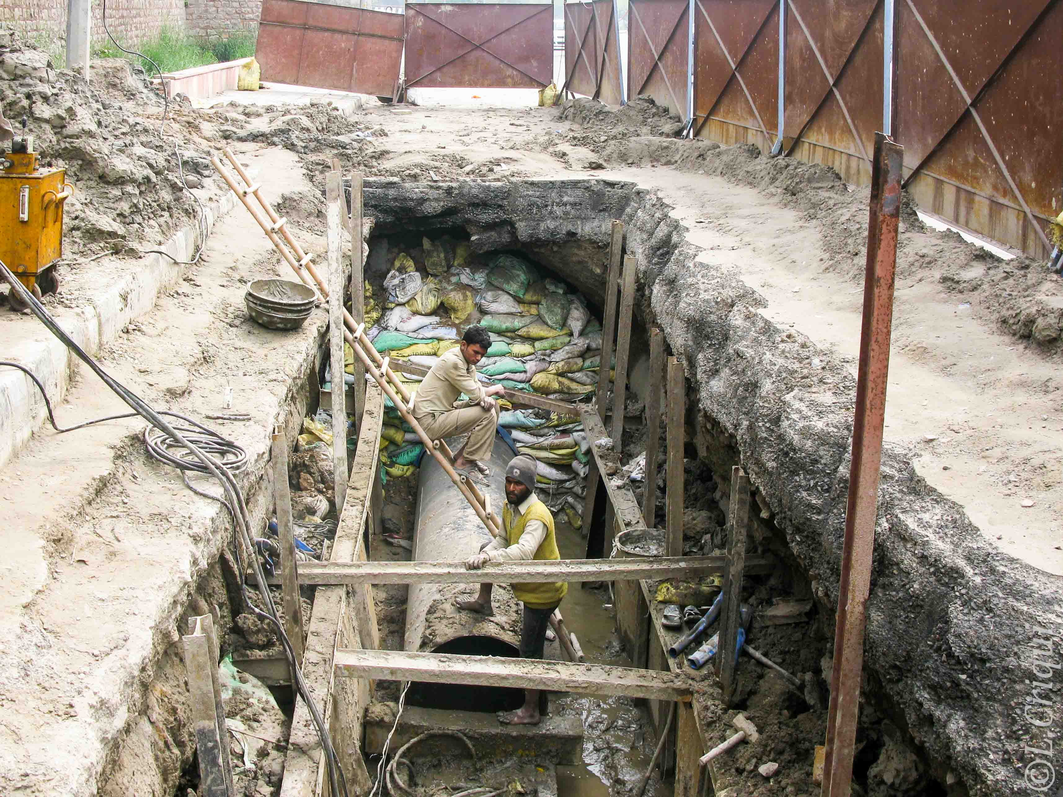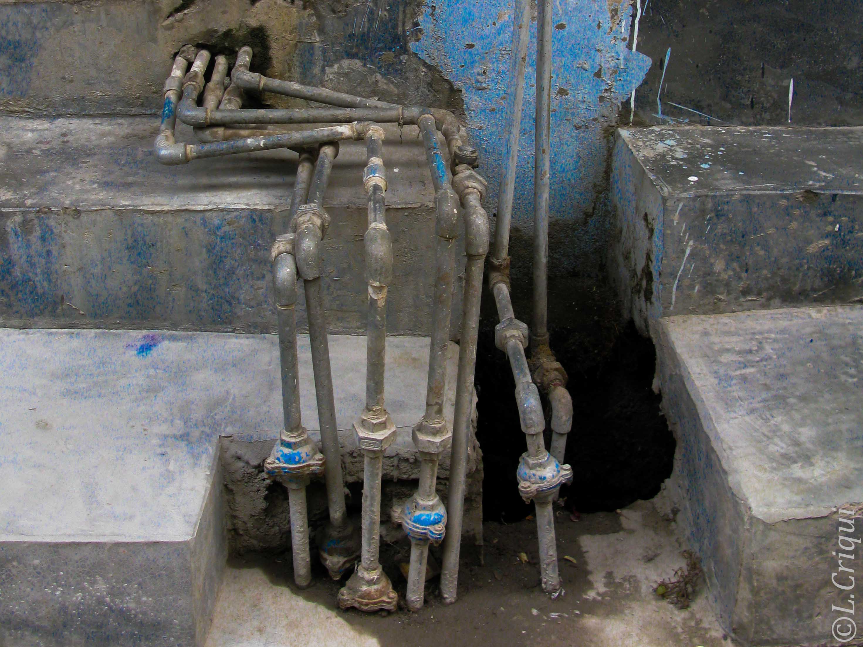 On y aperçoit aussi le caractère brouillon, sale et désordonné des chantiers, aussi officiels soient-ils : situés sur des bords de route non protégés ou en plein milieu des rues, ils perturbent la circulation et créent des fossés difficiles à traverser. Les travaux sont réalisés par des journaliers – cela coûte moins cher que d’investir dans des machines – qui travaillent avec leurs propres outils, sans sécurité, matériel ni formation. Les équipements sont ainsi souvent instables, mal positionnés, trop près d’autres installations, trop en surface, créant un encombrement néfaste à la distribution ultérieure de l’eau.