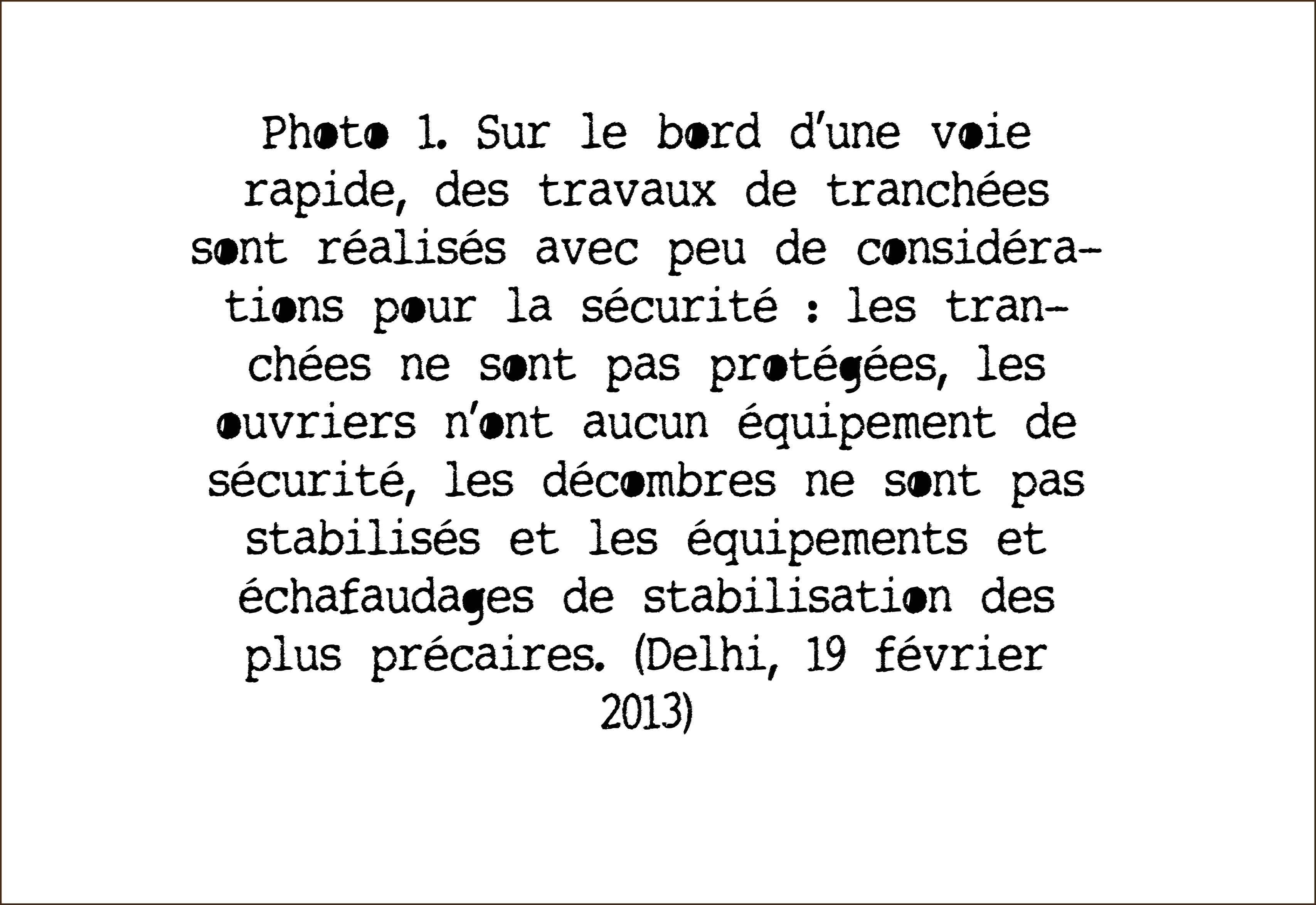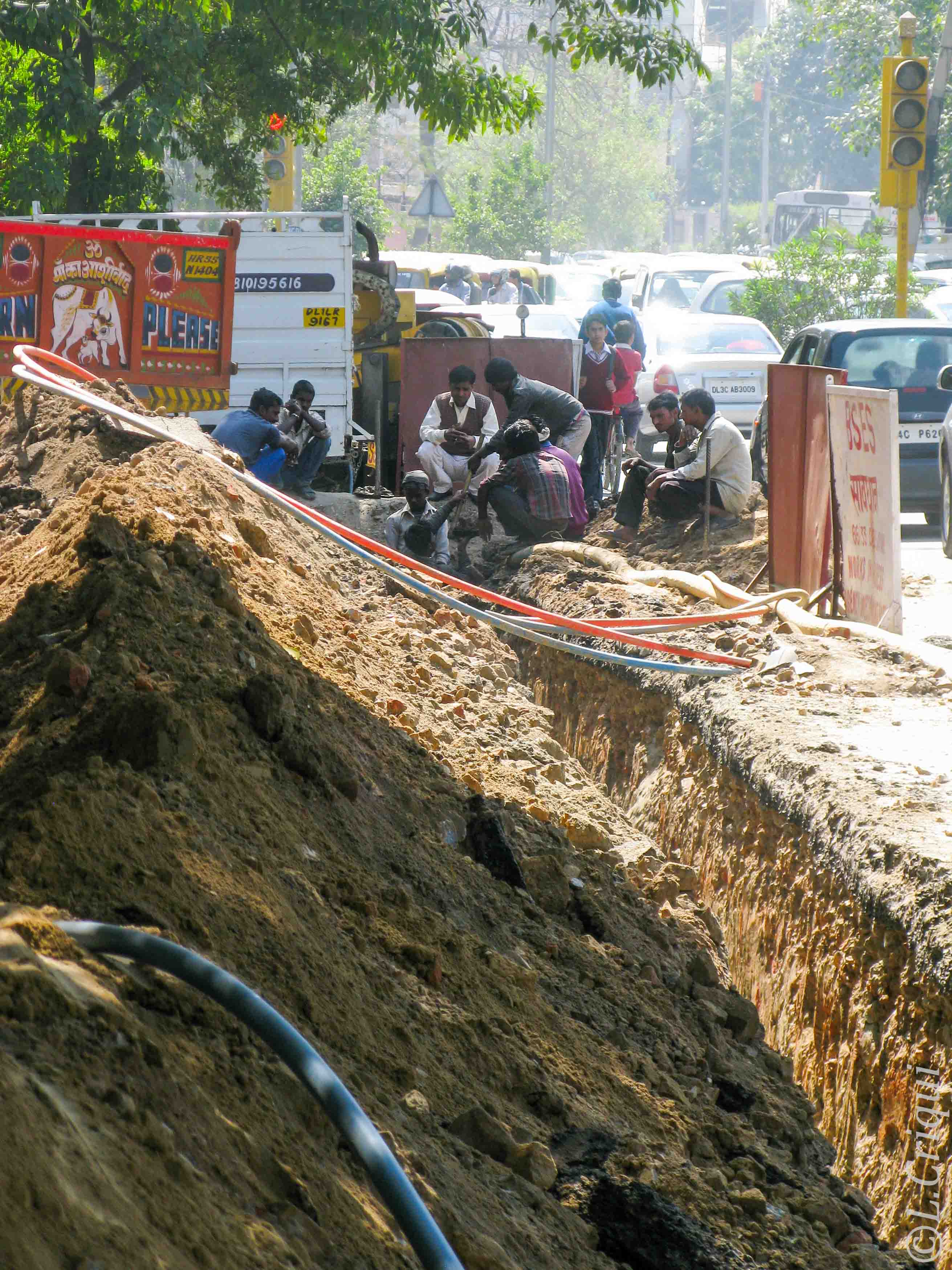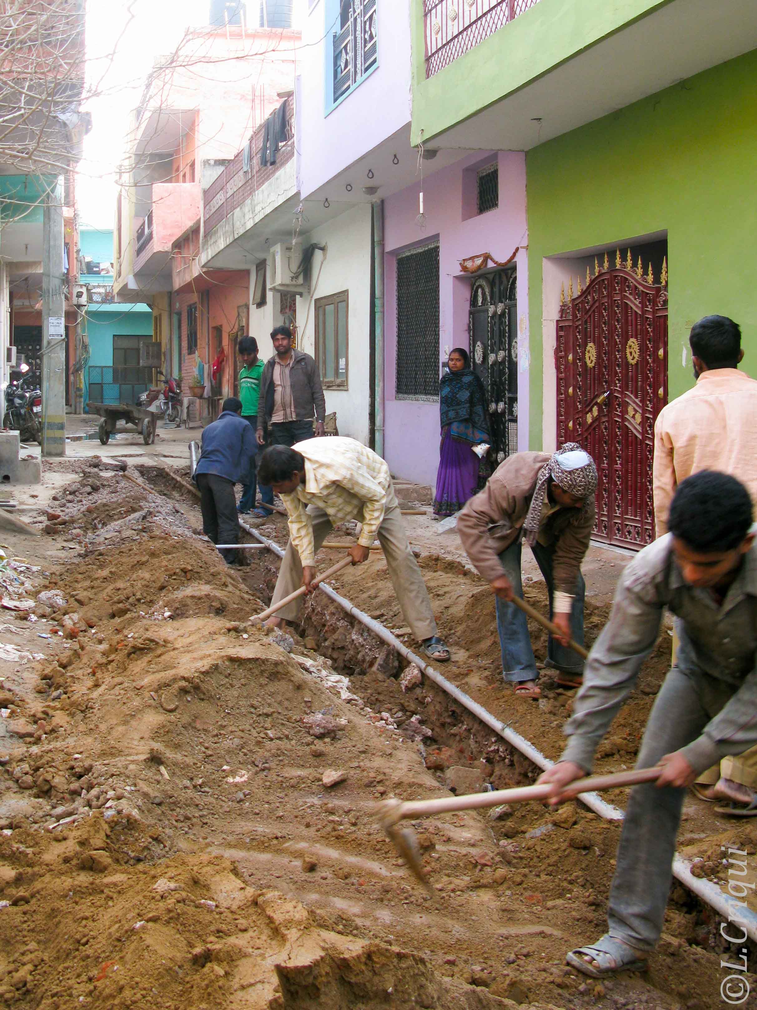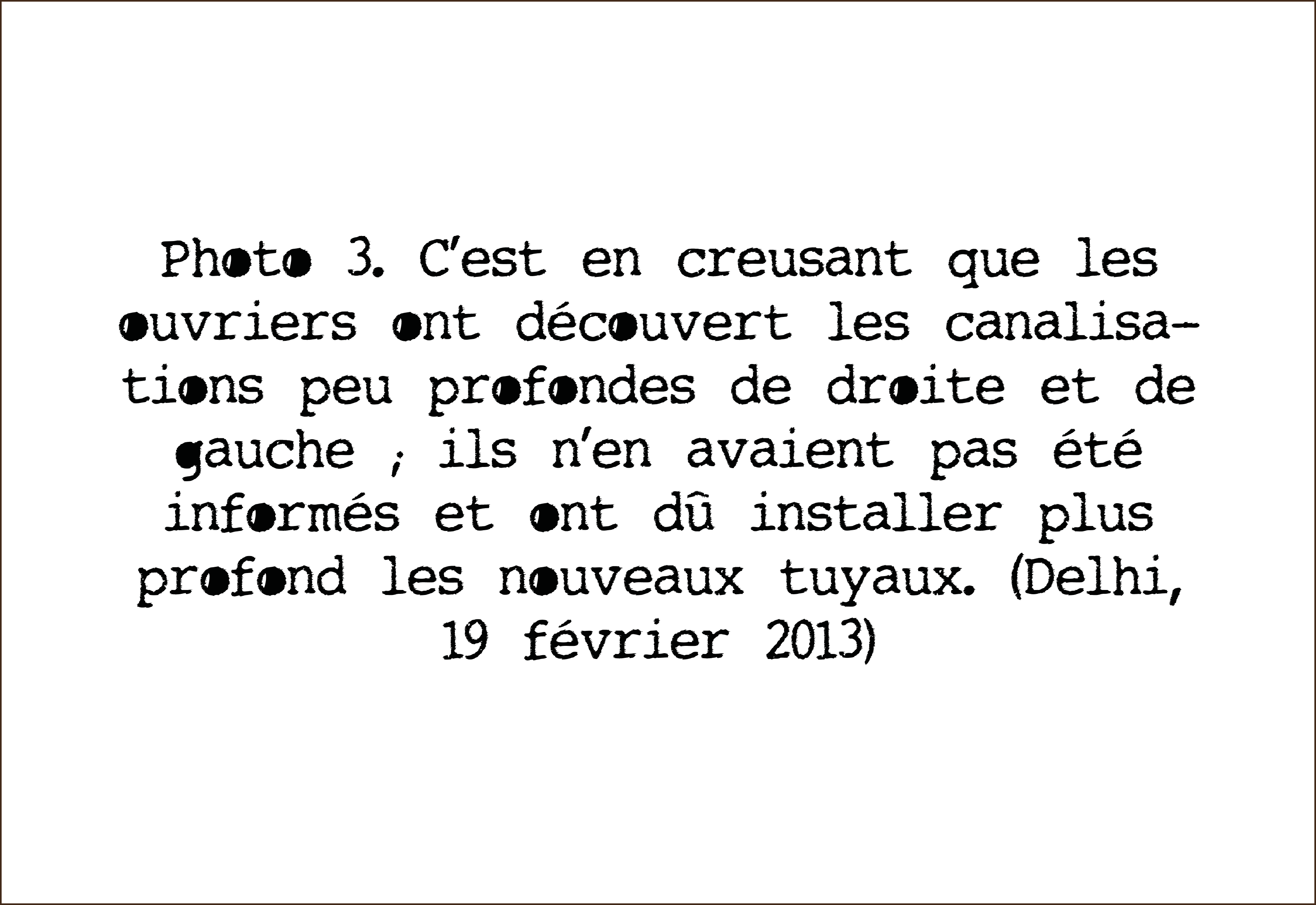 Les travaux de développement sont, à Delhi, un processus continu, généralisé et omniprésent. Rues éventrées, tranchées à ciel ouvert, matériaux entreposés sur les bords des routes constituent le paysage urbain quotidien des villes du Sud, auquel on ne peut échapper. C’est ce processus de construction et de viabilisation matérielle de la ville que ces photos illustrent. Elles révèlent tout d’abord les infrastructures de la ville d’habitude enterrées et cachées, les entrailles d’un fonctionnement, les supports d’une fabrique urbaine dont on a souvent peu conscience. C’est un monde souterrain qui apparaît dans les tranchées à chaque coin de rue. Et cela révèle des logiques urbaines qui sont parfois plus problématiques et perturbantes que ne le laissent entendre les promesses de raccordement, le modèle de déploiement du réseau « moderne » et par là d’intégration à la ville « développée ».