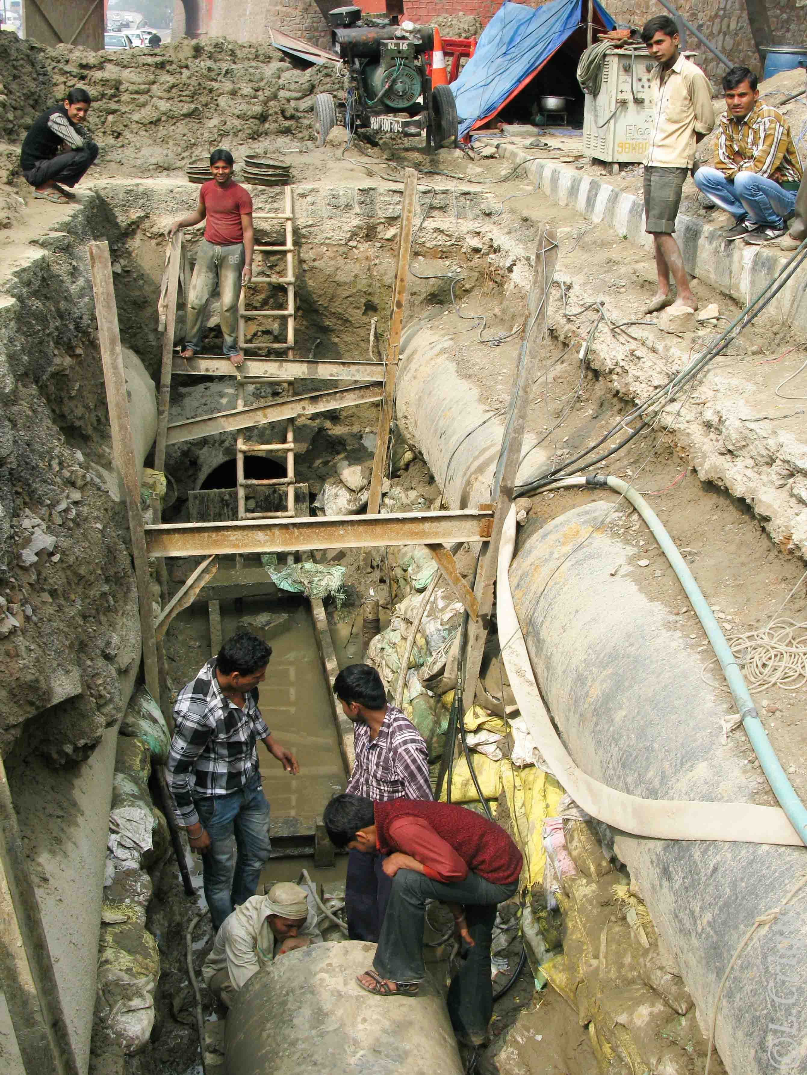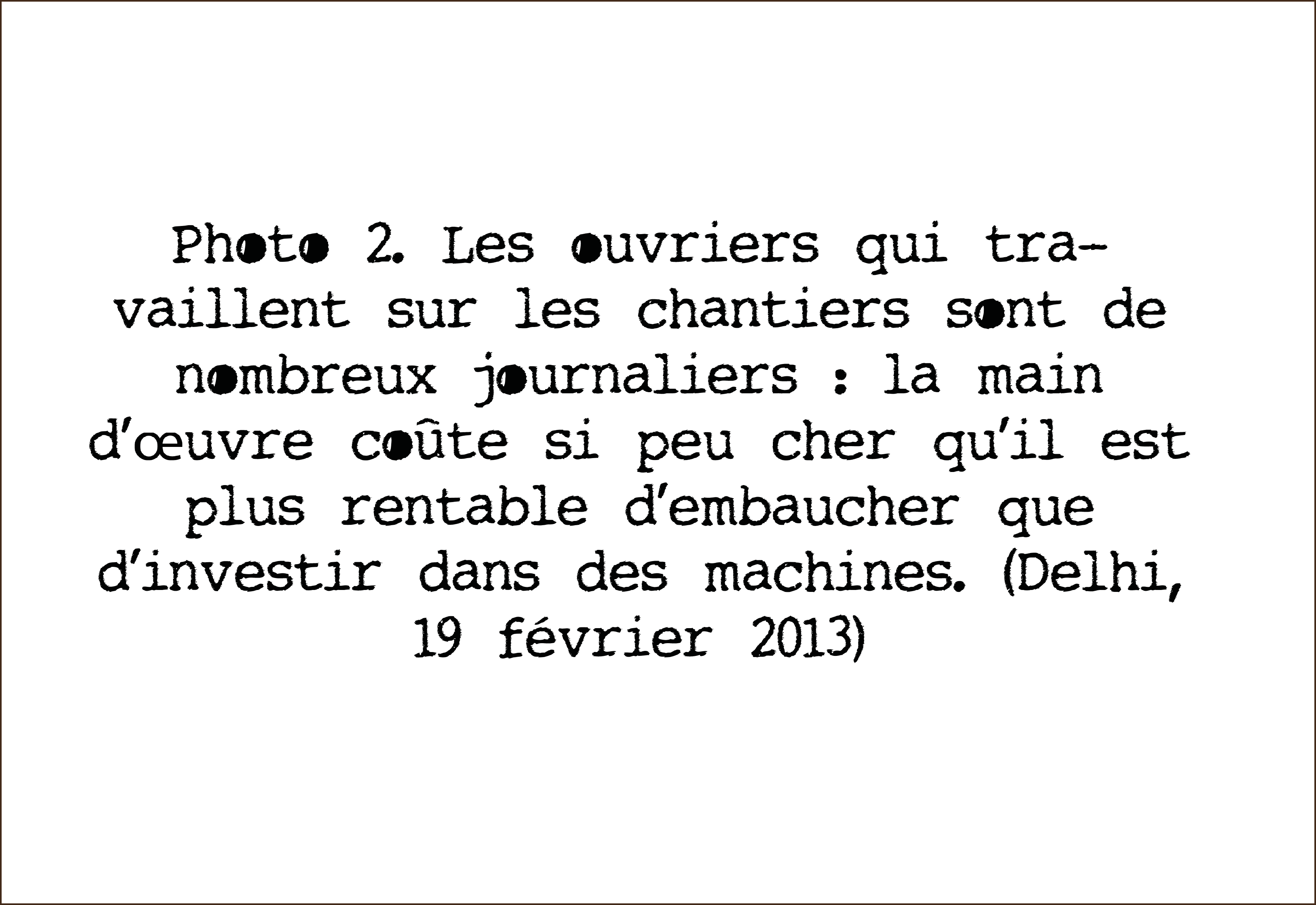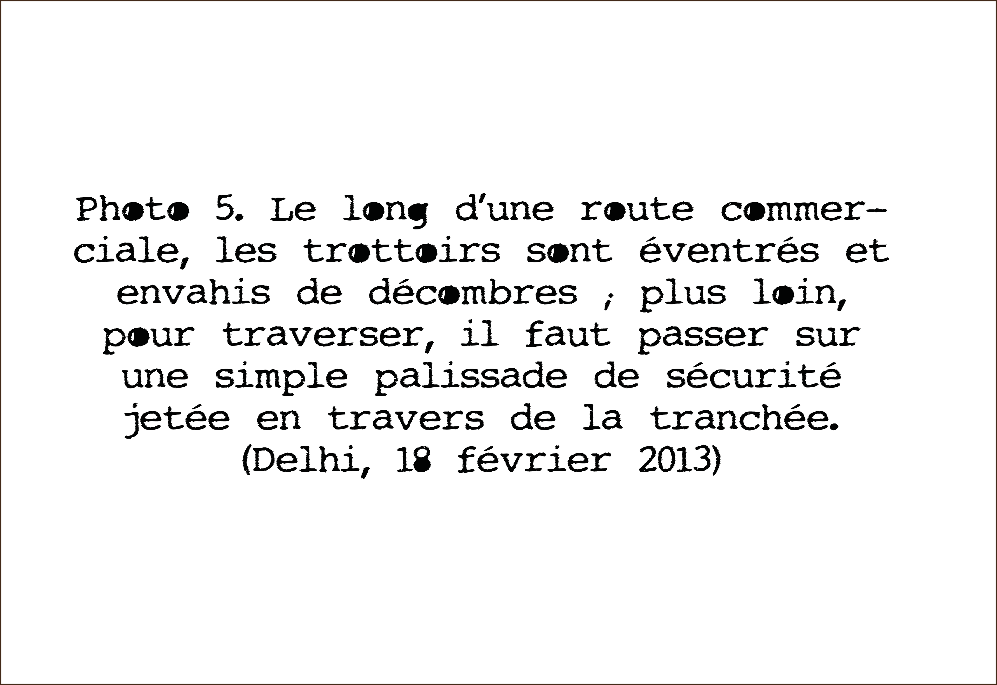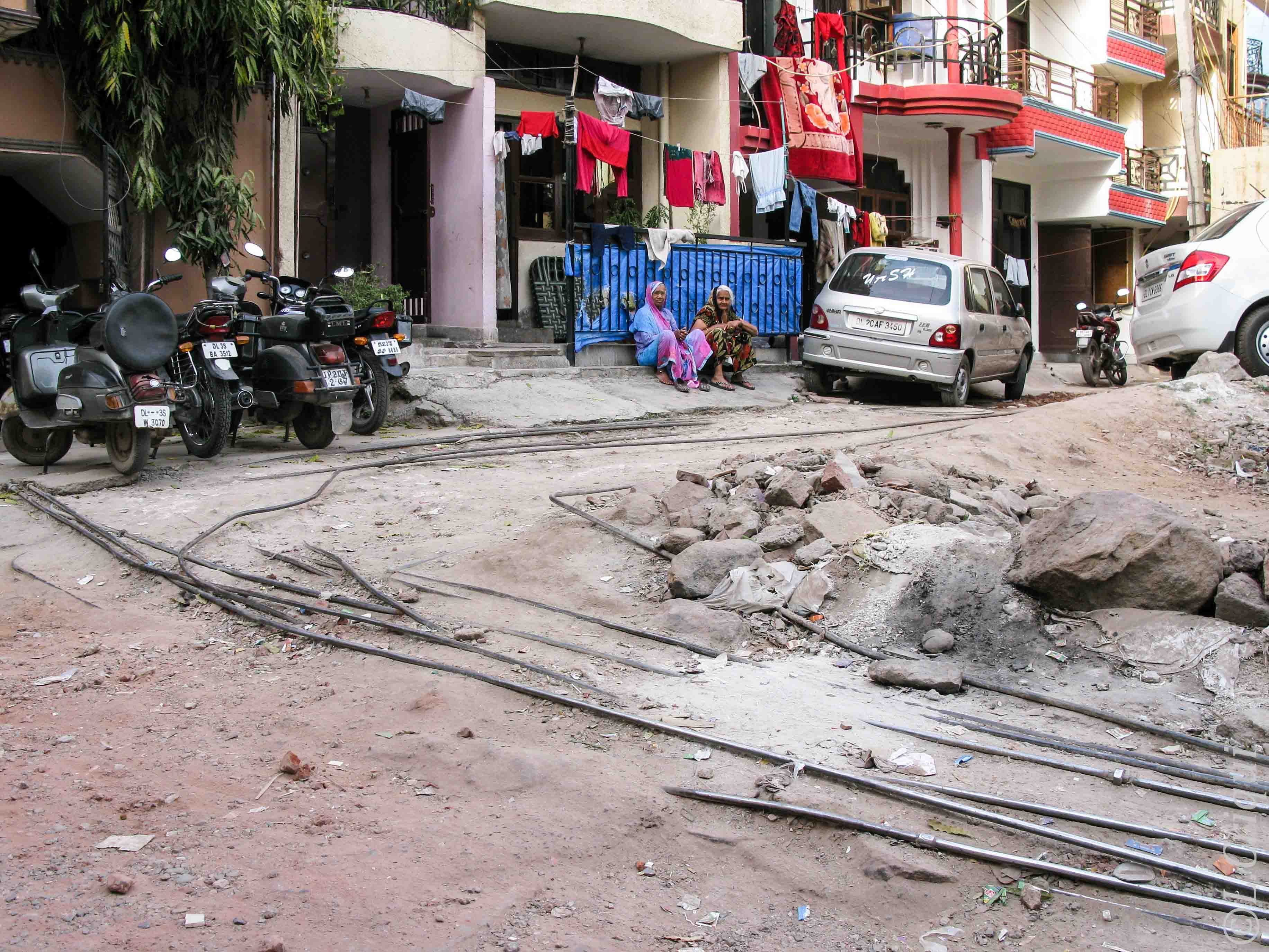 Les travaux de développement sont, à Delhi, un processus continu, généralisé et omniprésent. Rues éventrées, tranchées à ciel ouvert, matériaux entreposés sur les bords des routes constituent le paysage urbain quotidien des villes du Sud, auquel on ne peut échapper. C’est ce processus de construction et de viabilisation matérielle de la ville que ces photos illustrent. Elles révèlent tout d’abord les infrastructures de la ville d’habitude enterrées et cachées, les entrailles d’un fonctionnement, les supports d’une fabrique urbaine dont on a souvent peu conscience. C’est un monde souterrain qui apparaît dans les tranchées à chaque coin de rue. Et cela révèle des logiques urbaines qui sont parfois plus problématiques et perturbantes que ne le laissent entendre les promesses de raccordement, le modèle de déploiement du réseau « moderne » et par là d’intégration à la ville « développée ».