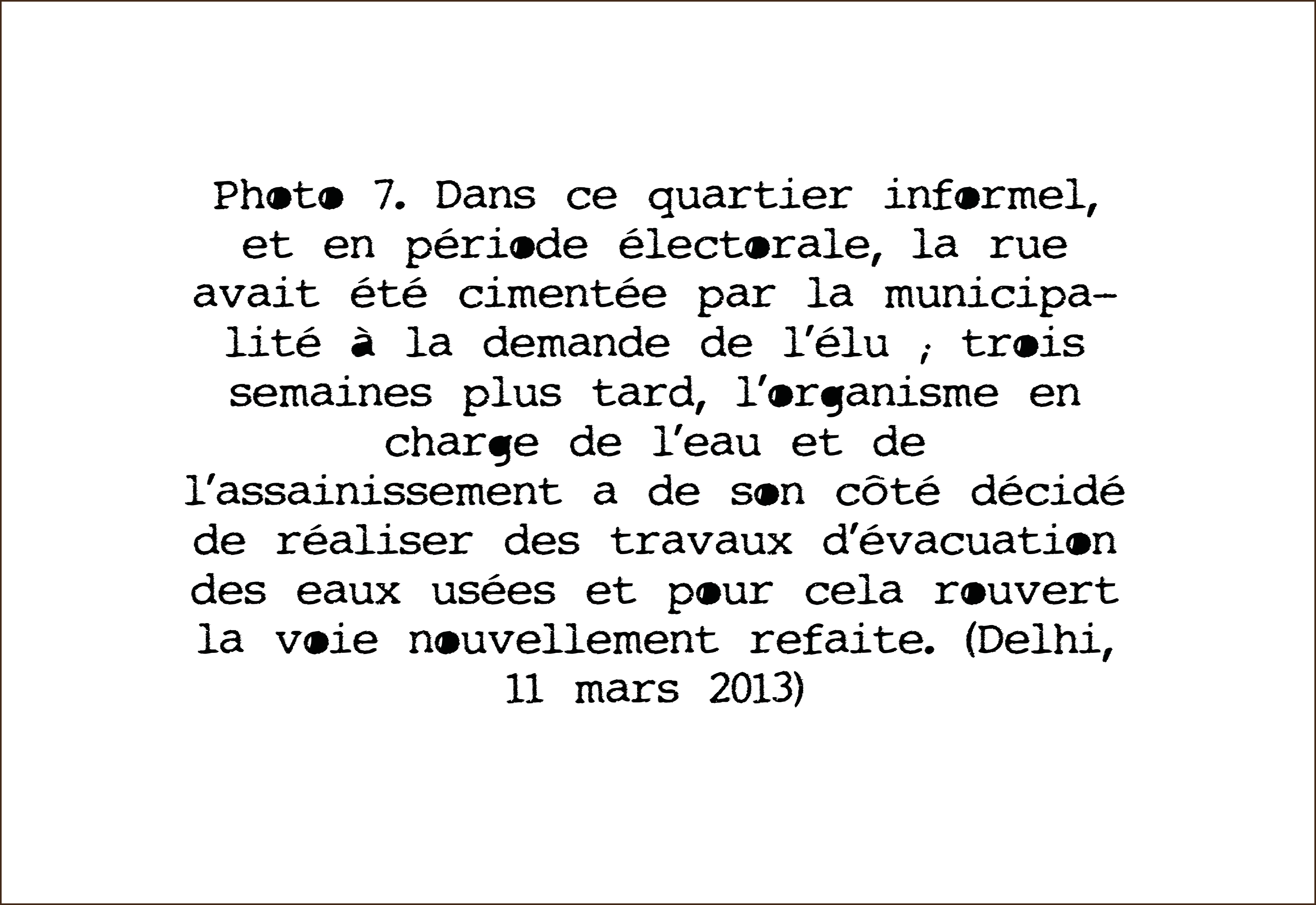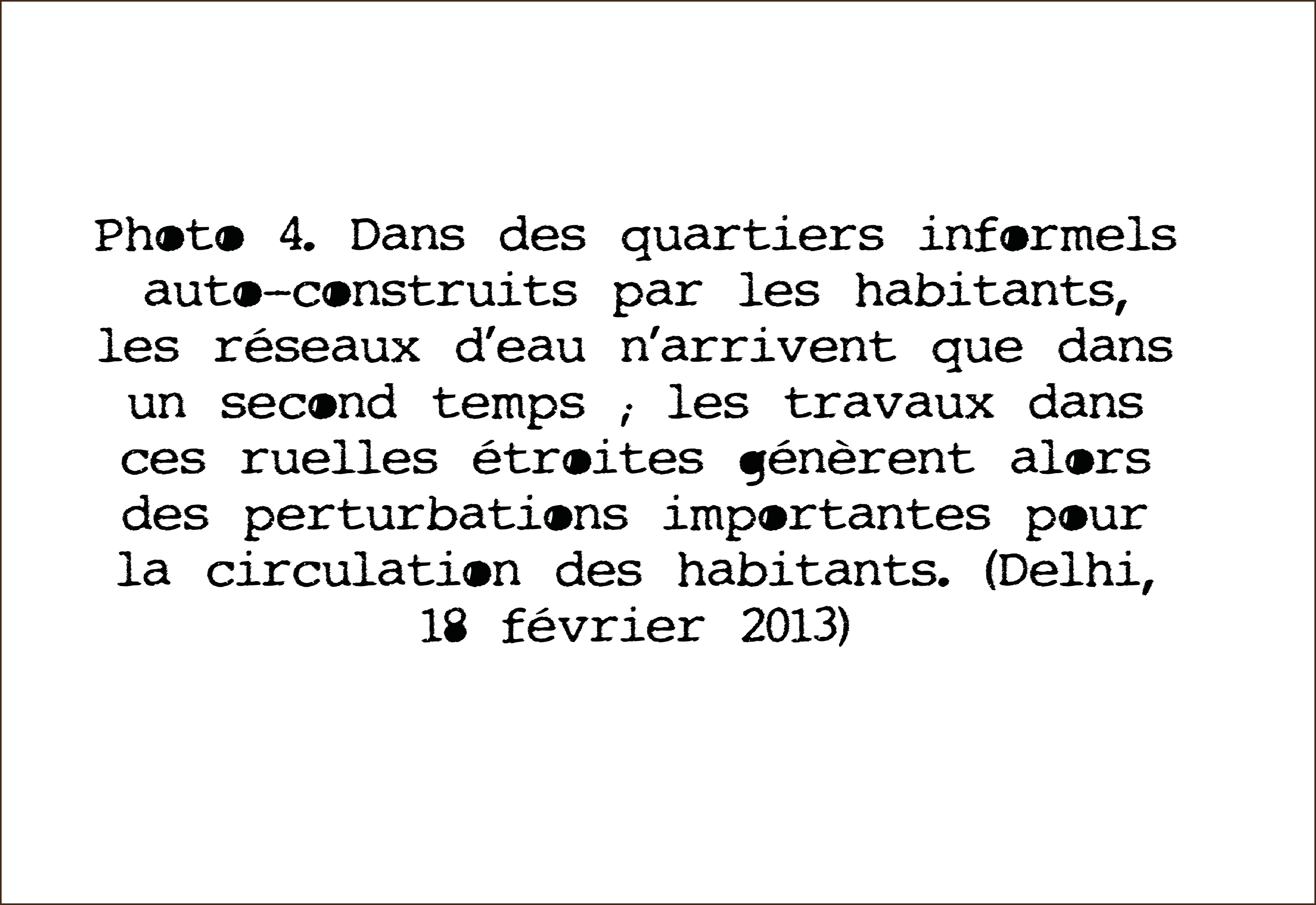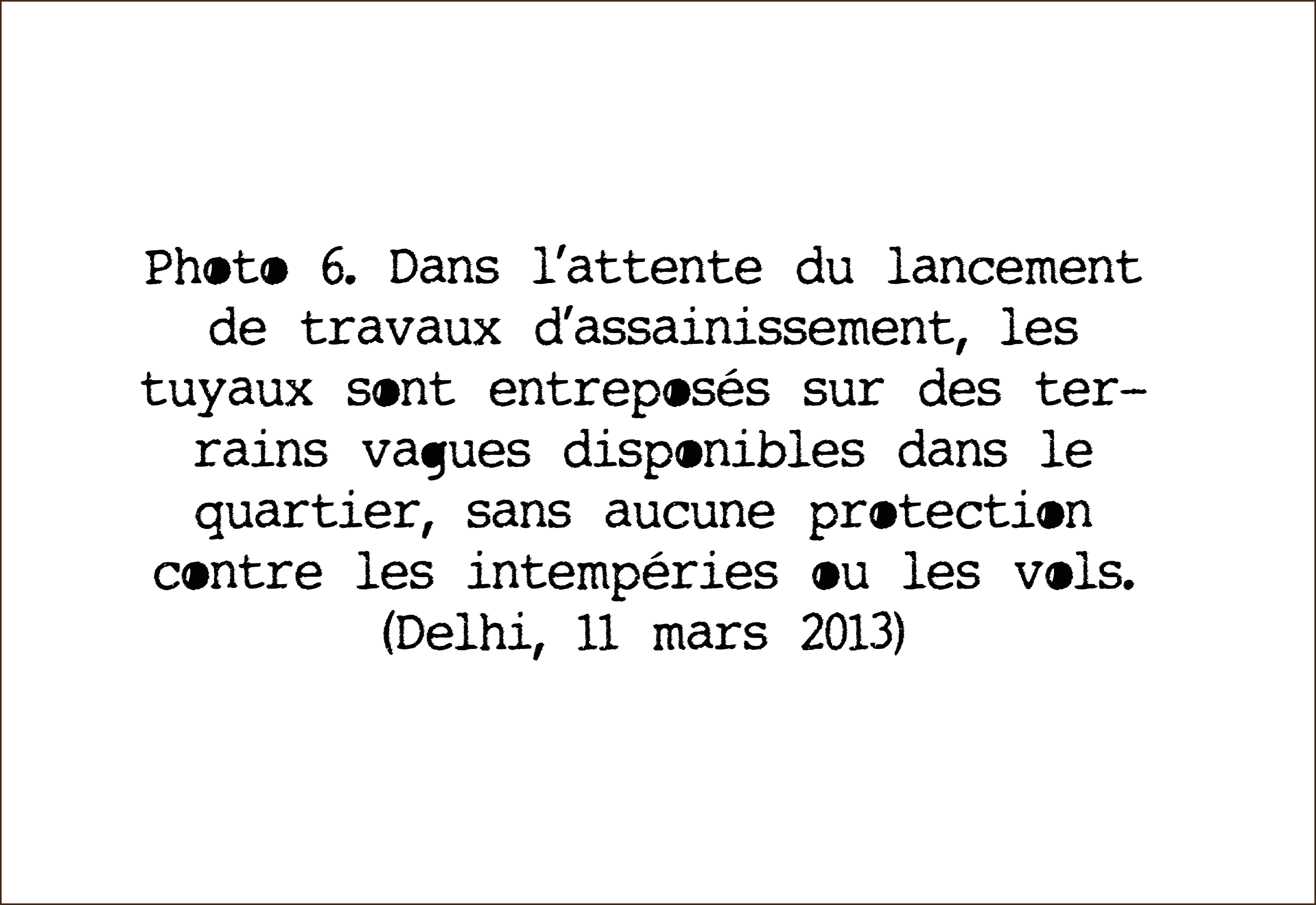Ce portfolio rend compte d’une enquête de terrain menée dans des quartiers populaires de Delhi entre janvier et mars 2013. Ces quartiers qui se sont développés hors du plan d’urbanisme font l’objet d’une politique de régularisation depuis quelques années, s’accompagnant de la réalisation de travaux de développement, notamment la viabilisation des routes et l’extension des réseaux d’eau et d’assainissement. À l’occasion des élections locales, ces travaux se multiplient, dans l’urgence, et les quartiers sont chamboulés par toute une série de chantiers concomitants. Derrière les promesses de raccordement, se cache ainsi une réalité beaucoup plus terre à terre : l’installation même des tuyaux, qui s’avère difficile dans des quartiers denses et irréguliers et qui génère des perturbations. Mon travail de recherche portait ainsi sur le processus concret de l’extension des réseaux.