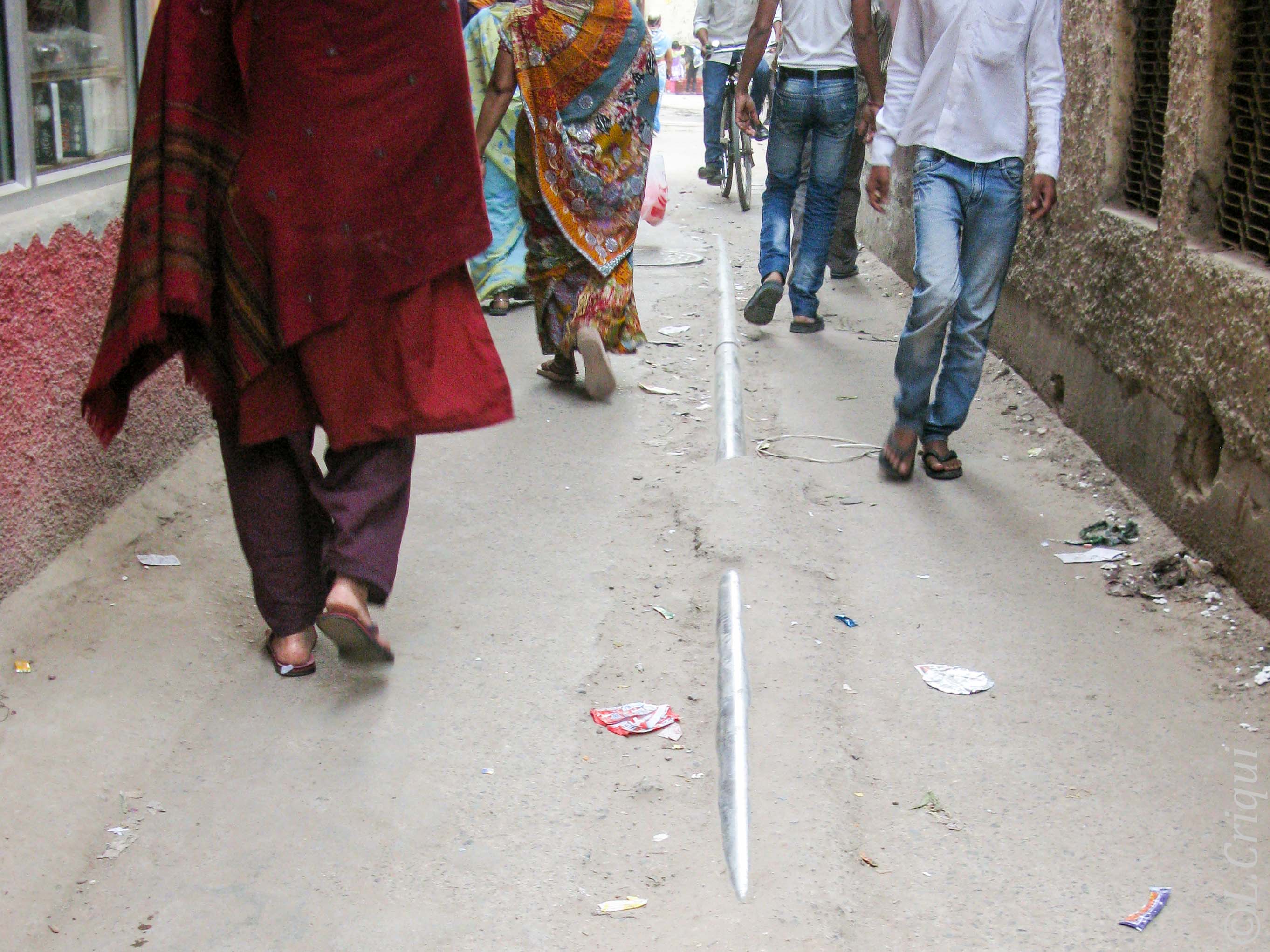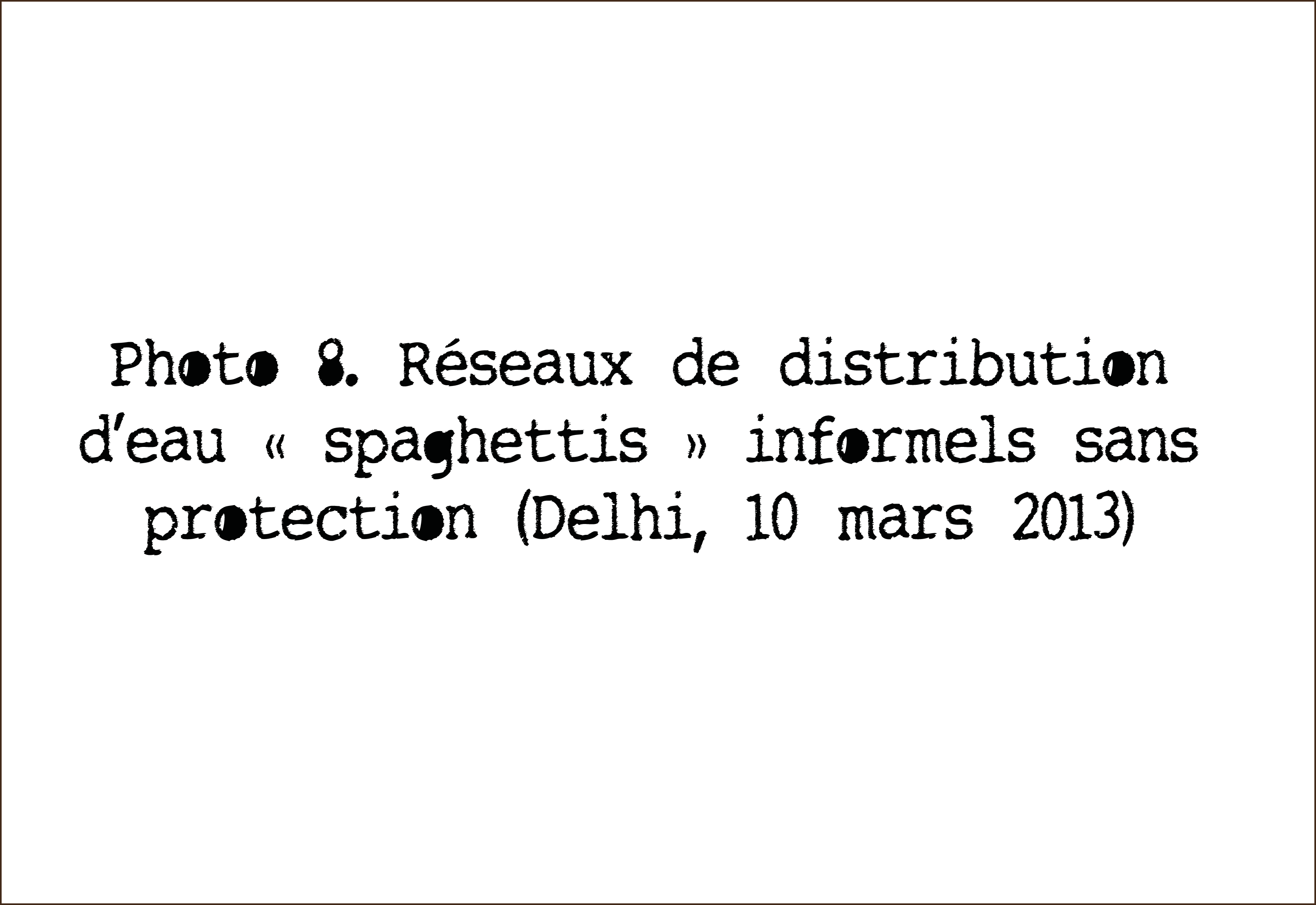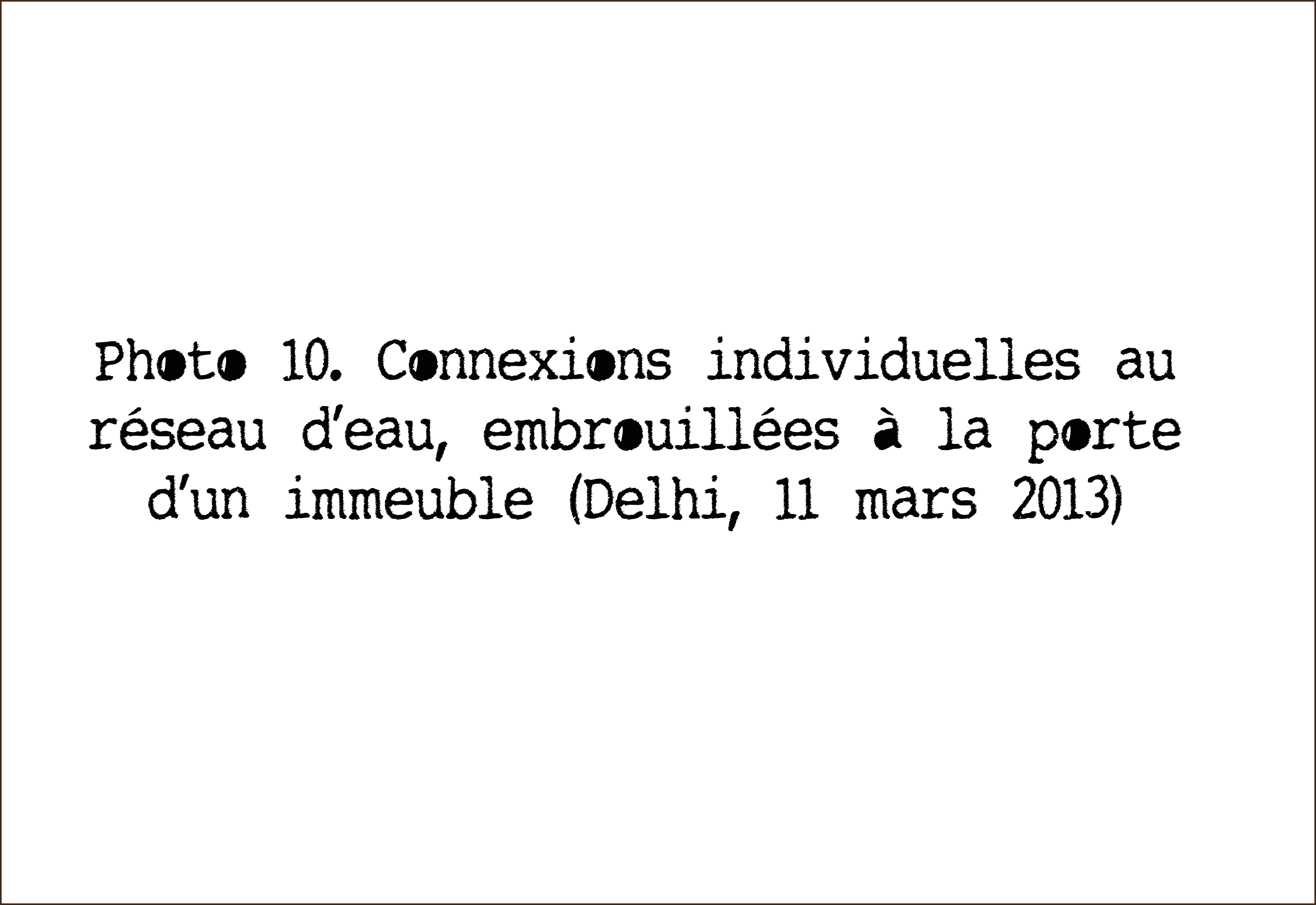 Ce portfolio rend compte d’une enquête de terrain menée dans des quartiers populaires de Delhi entre janvier et mars 2013. Ces quartiers qui se sont développés hors du plan d’urbanisme font l’objet d’une politique de régularisation depuis quelques années, s’accompagnant de la réalisation de travaux de développement, notamment la viabilisation des routes et l’extension des réseaux d’eau et d’assainissement. À l’occasion des élections locales, ces travaux se multiplient, dans l’urgence, et les quartiers sont chamboulés par toute une série de chantiers concomitants. Derrière les promesses de raccordement, se cache ainsi une réalité beaucoup plus terre à terre : l’installation même des tuyaux, qui s’avère difficile dans des quartiers denses et irréguliers et qui génère des perturbations. Mon travail de recherche portait ainsi sur le processus concret de l’extension des réseaux.