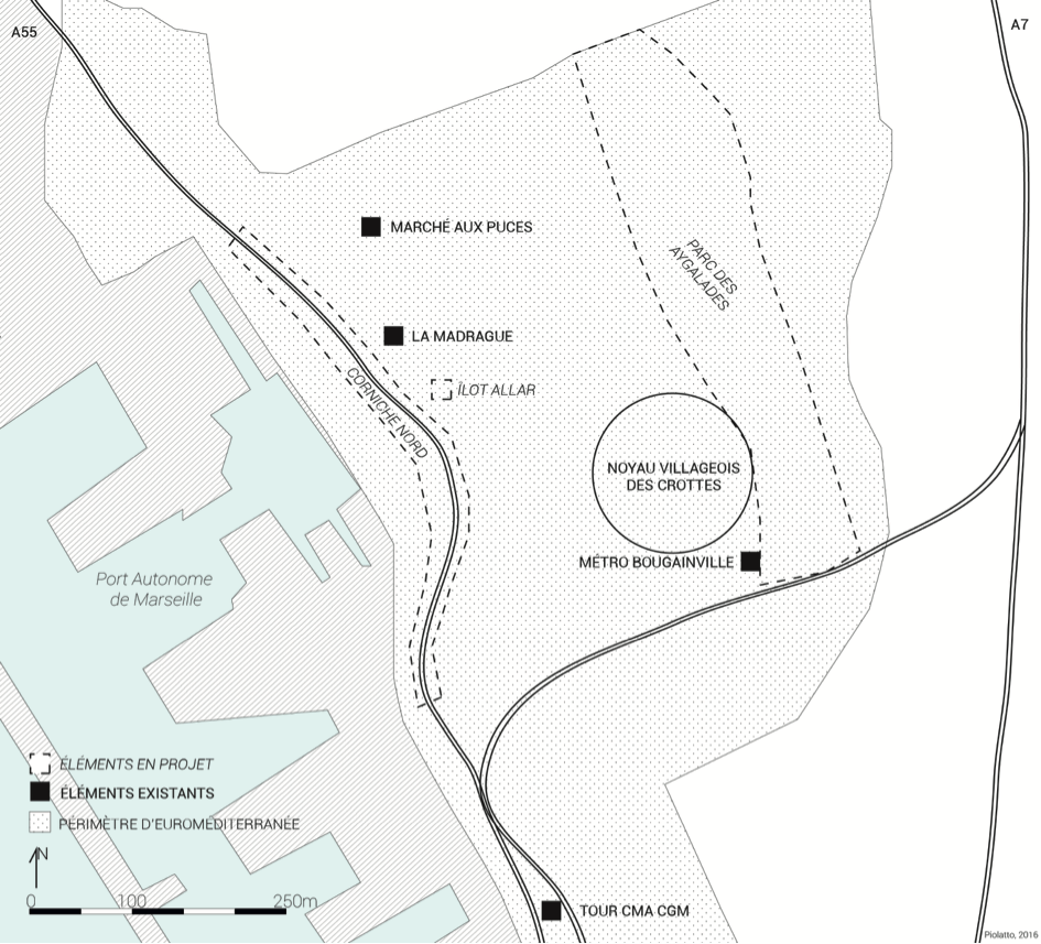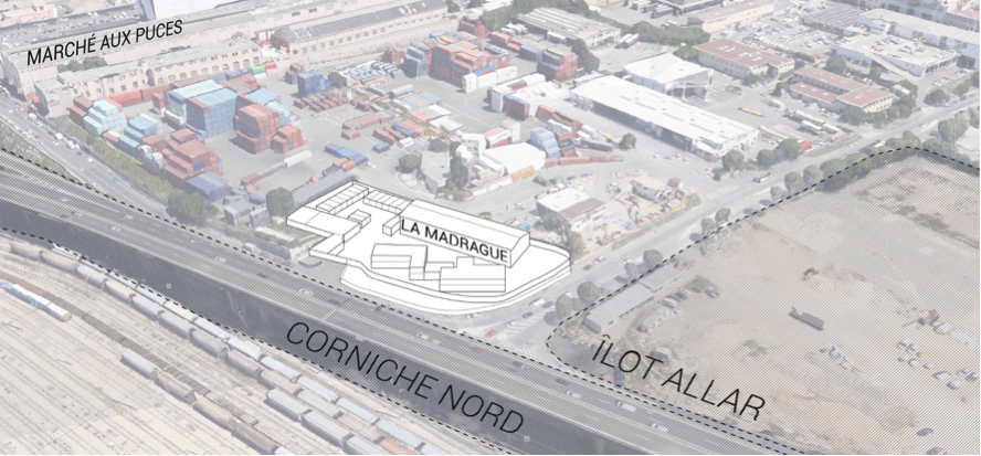 La Madrague marque le manque d’hospitalité de l’aménagement urbain aujourd’hui. Jusqu’à présent éloignée du centre-ville, elle est placée malgré elle sur le devant de la scène puisque située en face d’un îlot dont le traitement s’avère particulièrement délicat pour Euroméditerranée. En effet, cet îlot Allar doit montrer par l’exemple le potentiel de ce nouveau morceau de ville, dans la démarche EcoCité. Surnommé « Smartseille » par la ville, ce macro-lot bientôt livré par le groupe Eiffage doit parvenir à convaincre investisseurs privés et futurs nouveaux habitants de l’intérêt des transformations futures de ce territoire. Le site de la Madrague borde également ce qui deviendrait dans quelques années la « Corniche nord », une promenade littorale piétonne à la place de l’autoroute qui cache actuellement la vue sur la mer. Elle se trouve entourée d’opérations de grande envergure qui doivent se développer rapidement. Euroméditerranée met en place des dispositifs de partenariats sur de nouvelles échelles. En effet, l’appel à manifestation d’intérêt sur le site XXL a été remporté par le Groupe Bouygues, qui prend donc les rennes de la réalisation d’un éco-quartier qui s’étend sur 14 hectares, comprenant la mutation du marché aux Puces des Arnavaux, et ce avec l’espoir de voir sortir les premiers édifices dans cinq ans.