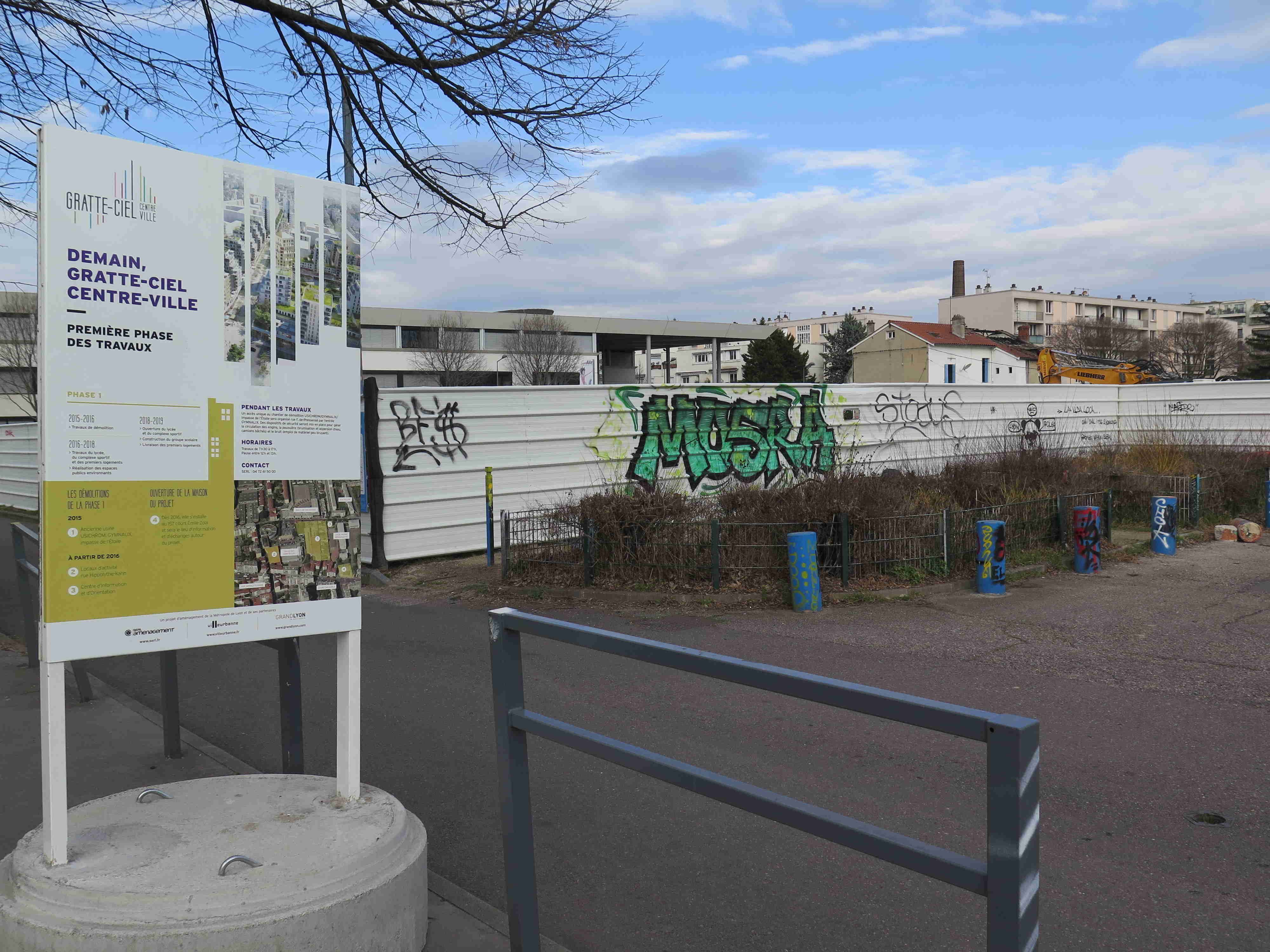 Un peu plus loin, lorsque l’on entre à l’intérieur du périmètre de la zone d’aménagement concertée du projet urbain Gratte-Ciel Nord, les stratégies d’installation sont très différentes, le paysage qui en résulte également. L’aménageur a mis en place une charte de chantier et un accompagnement du chantier en direction des habitants, passants et voisins. Les couleurs dominantes sont le blanc et le gris clair. Les couleurs génériques des chantiers (rouge, jaune, noir), ont disparu. Les chantiers sont marqués par une signalétique homogène et institutionnelle.