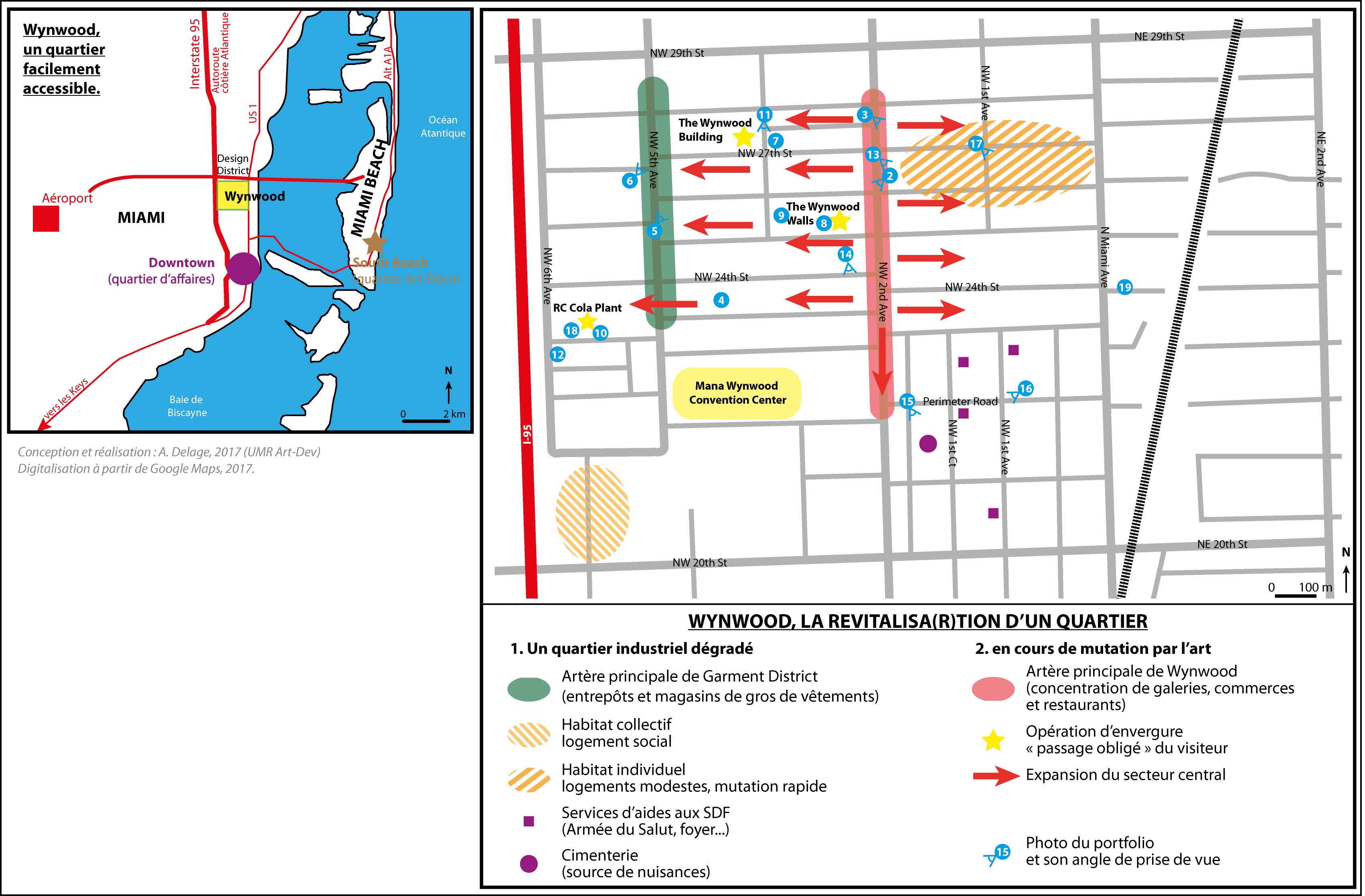 En 2013, les acteurs locaux se sont organisés en Business Improvement District (Wynwood BID), une forme d’organisation communautaire courante aux Etats-Unis où les propriétaires du quartier (commerces, restaurants, etc.) financent la gestion, l’amélioration et la promotion du secteur (carte du périmètre du BID). Le BID est un interlocuteur privilégié de la Ville de Miami. En l’occurrence, il a participé à la négociation sur le changement d’affectation des sols du quartier, passant de mixte industriel et commercial à exclusivement commercial, à l’exception de deux zones résidentielles et une zone d’industrie légère (2015). Il est également impliqué dans la redéfinition du stationnement, vu comme un levier d’attractivité du quartier.