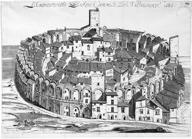 1. Le recyclage des arènes romaines d’Arles en bastide au Moyen-Âge (Gravure de Jacques Peytret, 1666, BNF)