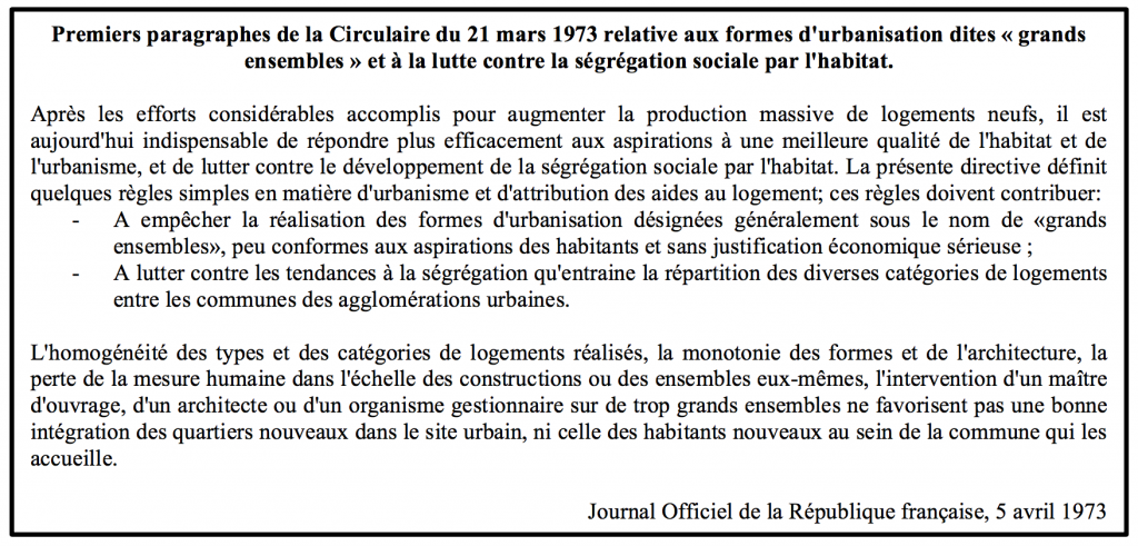 Le premier tableau géographique complet de la banlieue parisienne apparaît sous la plume d’Albert Demangeon en 1934 dans Paris, la ville et sa banlieue (Demangeon, 1934), suivis dans les années 1950 par Pierre Georges qui présente la banlieue comme « une forme moderne de développement urbain » (Georges, 1950). Les ouvrages parus en 2015 sur la banlieue ont une toute autre vision de ce territoire avec des titres particulièrement évocateurs : En finir avec les banlieues ? de Thomas Kirszbaum (2015) ou « Ma cité a craqué » pour le dernier numéro de la revue Mouvements (2015). Cette transition n’est pas soudaine et révèle non seulement une évolution sémantique importante des termes associés à la banlieue, mais aussi les crises importantes qui l’ont traversée. Si dans les années 1950-1960, les grands ensembles construits dans les banlieues françaises offrent tout le confort moderne, particulièrement appréciable au sortir de la guerre, ces quartiers apparaissent dès les années 1970 comme des lieux de concentration des maux sociaux et économiques de la France. Ainsi en 1973, la circulaire Guichard suggère d’arrêter la construction de grands ensembles et de favoriser un habitat permettant une intégration de ces quartiers à leurs communes afin de limiter les effets de ségrégation.