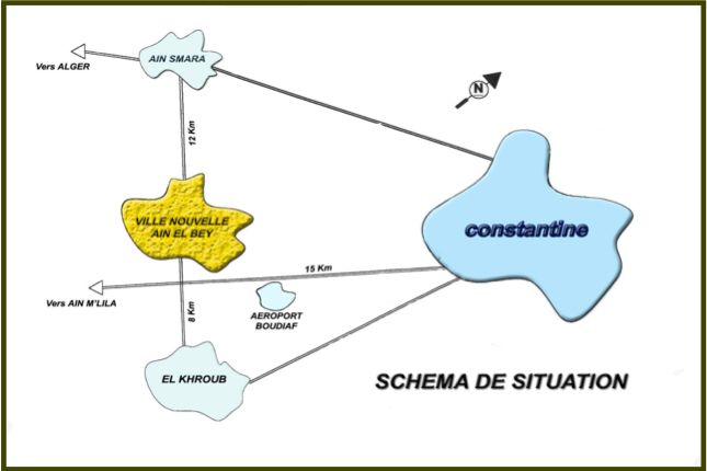 La formule avancée et retenue est la création d’une ville ex nihilo sur le plateau d’Ain El Bey, situé à 15km au sud de Constantine. D’une superficie de 1 500 hectares, celui-ci, qui présente beaucoup d’avantages, peut accueillir la nouvelle entité urbaine qui est appelée à abriter, à long terme, près de 335 582 âmes et serait un facteur déterminant dans la maîtrise de la croissance urbaine et spatiale.