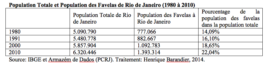 À Rio de Janeiro, les favelas constituent la face la plus visible de l’informalité, qui se présente également sous d’autres formes, comme notamment les lotissements clandestins dans la zone ouest de la ville. Les caractéristiques communes sont la précarité des infrastructures installées, l’auto-construction des logements et, bien sûr, l’occupation d’espaces à l’environnement fragile. Selon le Recensement Démographique de l’IBGE1 de 2010, plus de 20% de la population de Rio de Janeiro vit dans des favelas, une proportion qui ne cesse d’augmenter à chaque décennie.